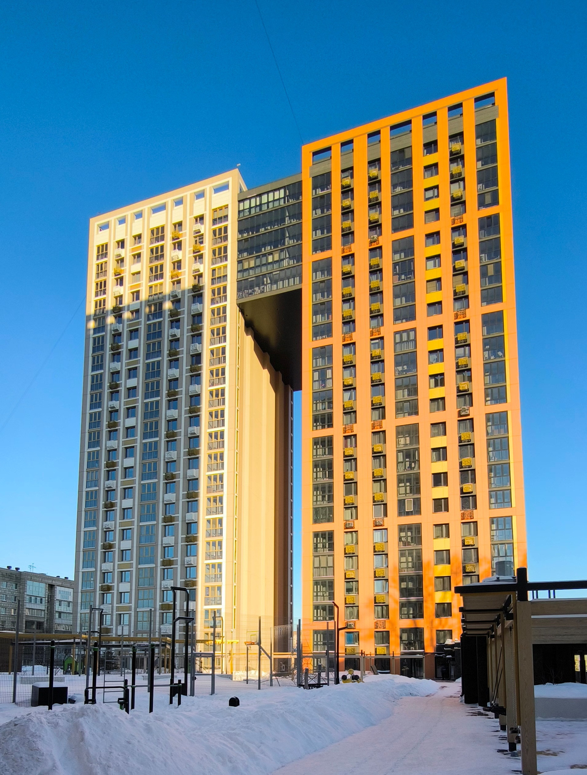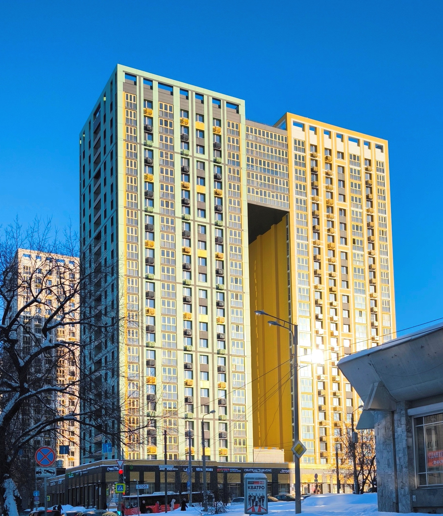 Под жилой частью комплекса размещен стилобат с торговыми галереями, паркингом и зоной развлечений, на кровле которого расположены детская площадка и зона для отдыха.