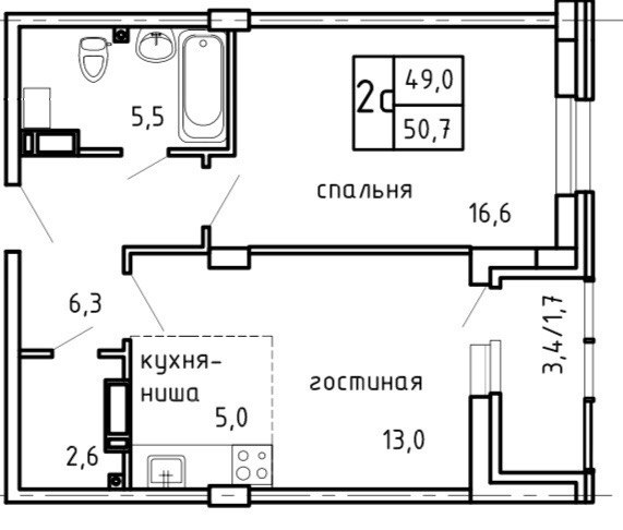Общая площадь 48.7 м2