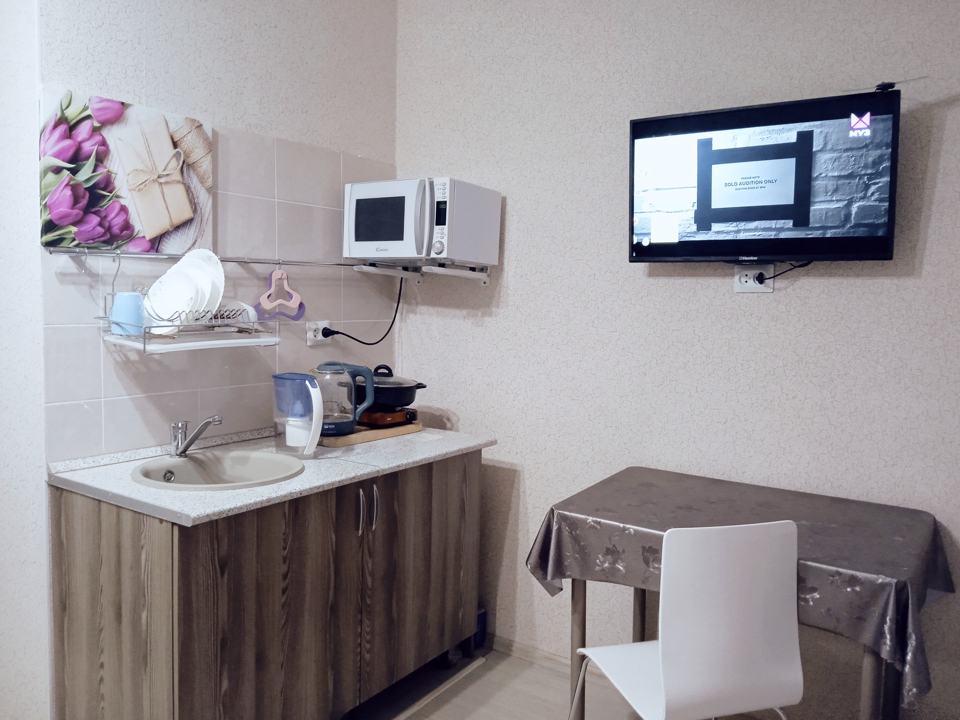 Также имеется шкаф с зеркалом в полный рост, компактный холодильник, стол и микроволновка.