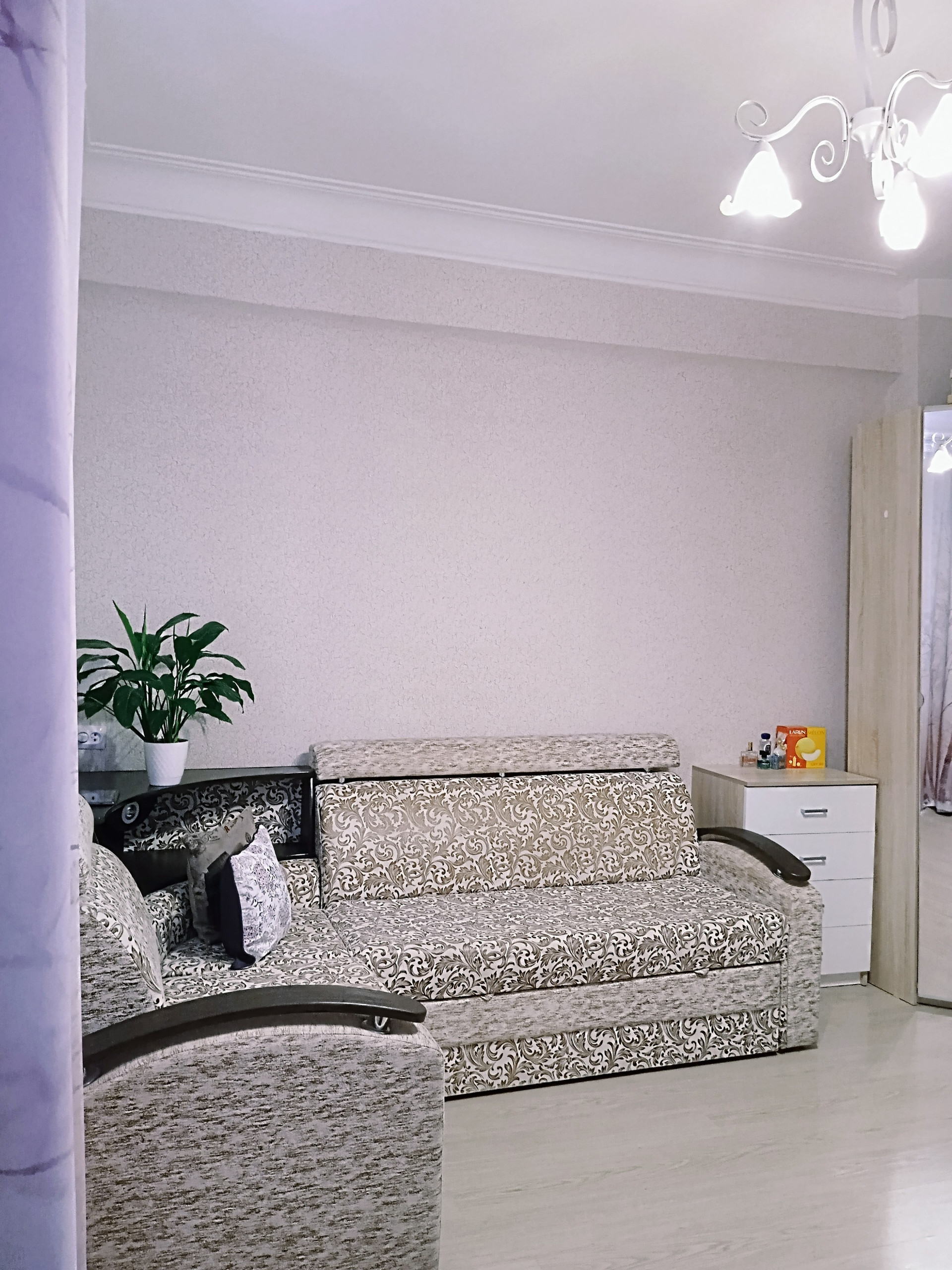 В студии есть всё необходимое; выделена кухонная зона и зона отдыха, в которой большой угловой диван с вместительным отсеком для хранения.