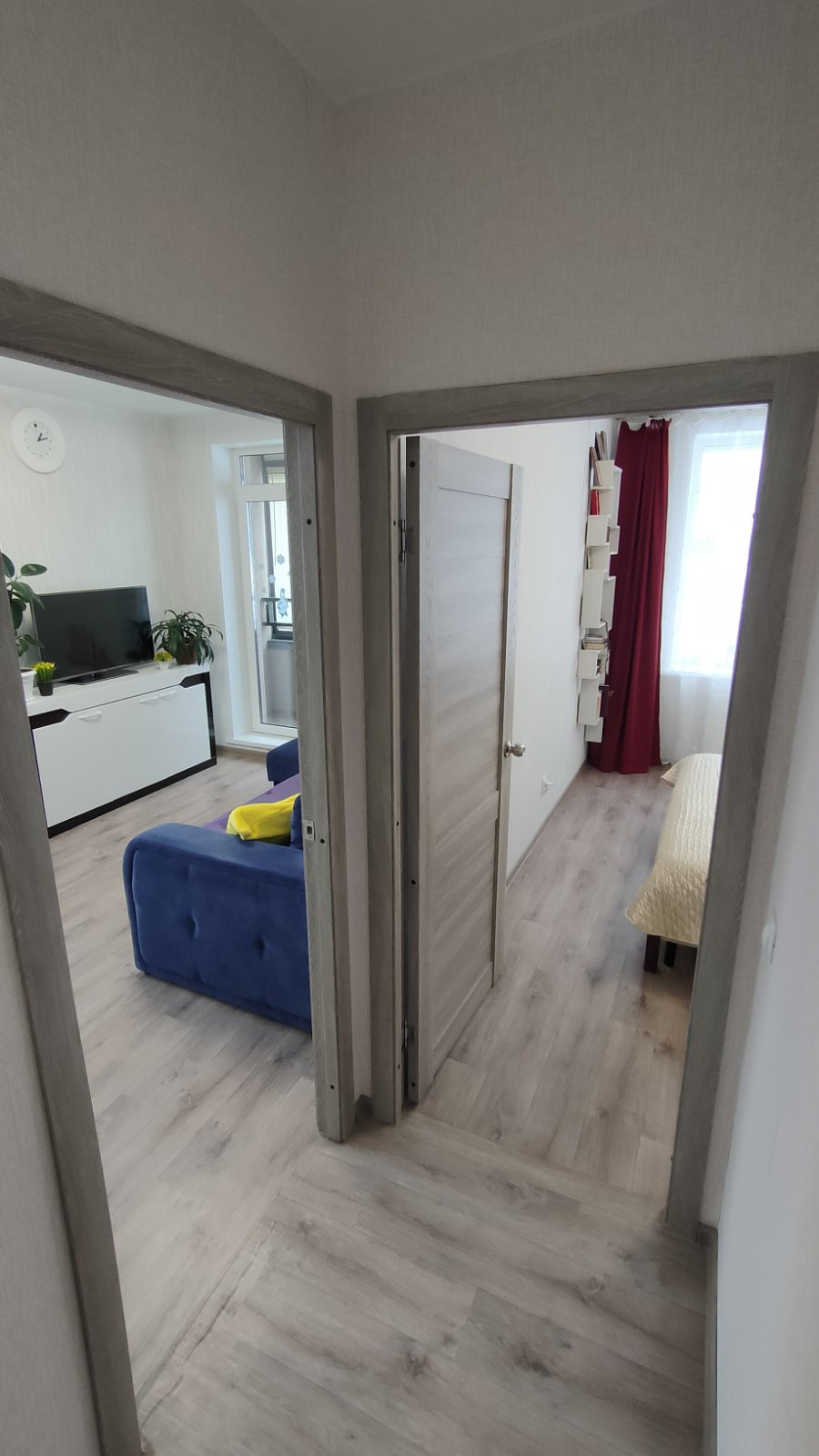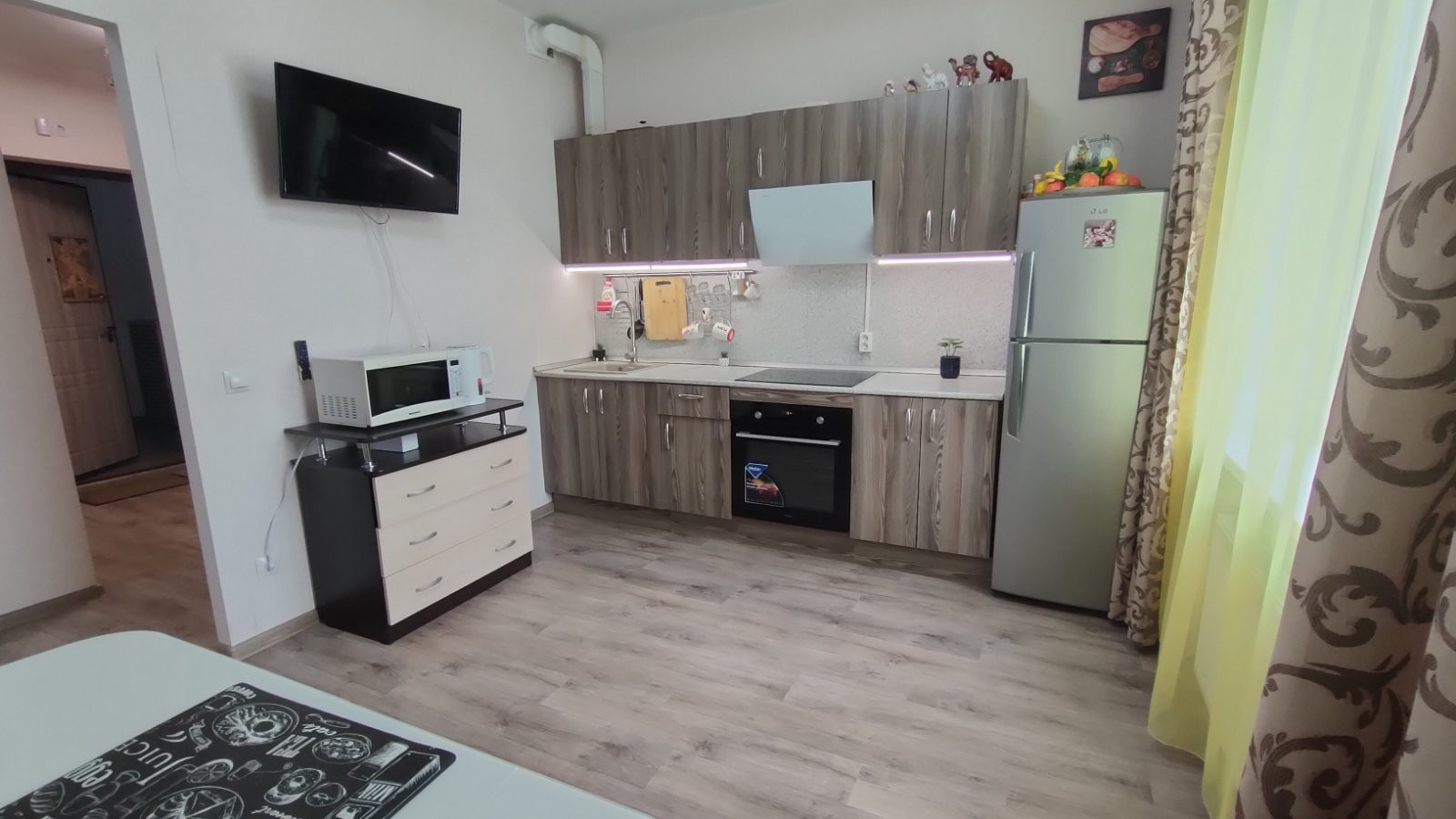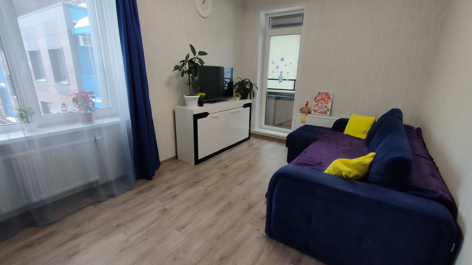 - Качественный ремонт от застройщика: металлопластиковые окна, на полу линолеум 32 класс, на стенах виниловые обои нейтральных оттенков, натяжные потолки, хорошие межкомнатные двери, в санузле керамическая плитка.