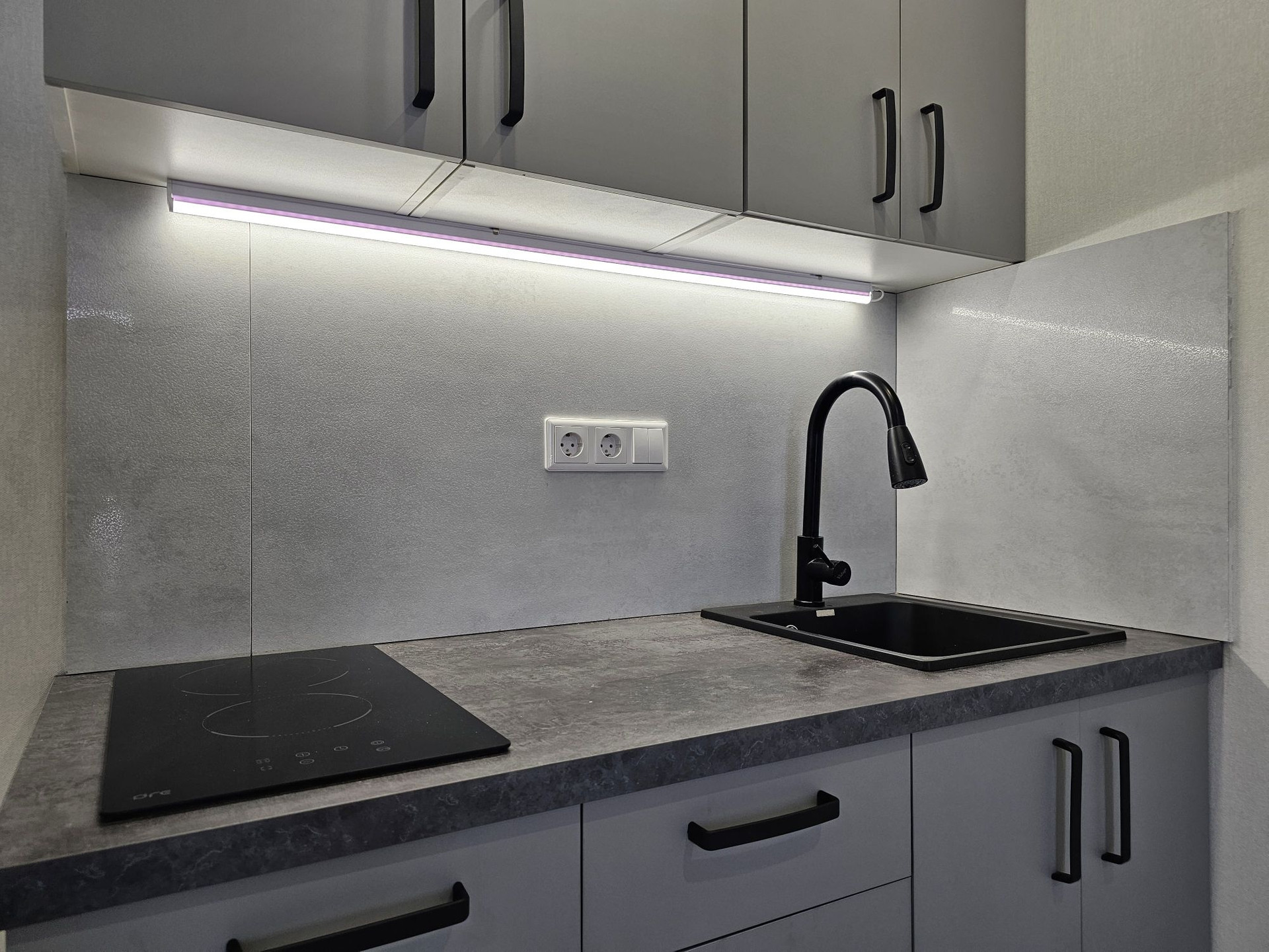 Выделена кухонная зона, куда установлен новый, встроенный кухонный гарнитур с варочной поверхностью и подсветкой, а слева от него оборудовано место под холодильник.