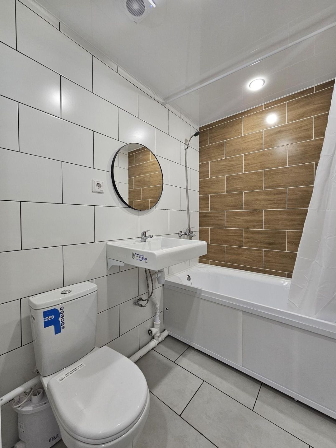 Санузел отделан кафелем, под раковиной оборудовано место под стиральную машину с подачей воды, сливом и розеткой
