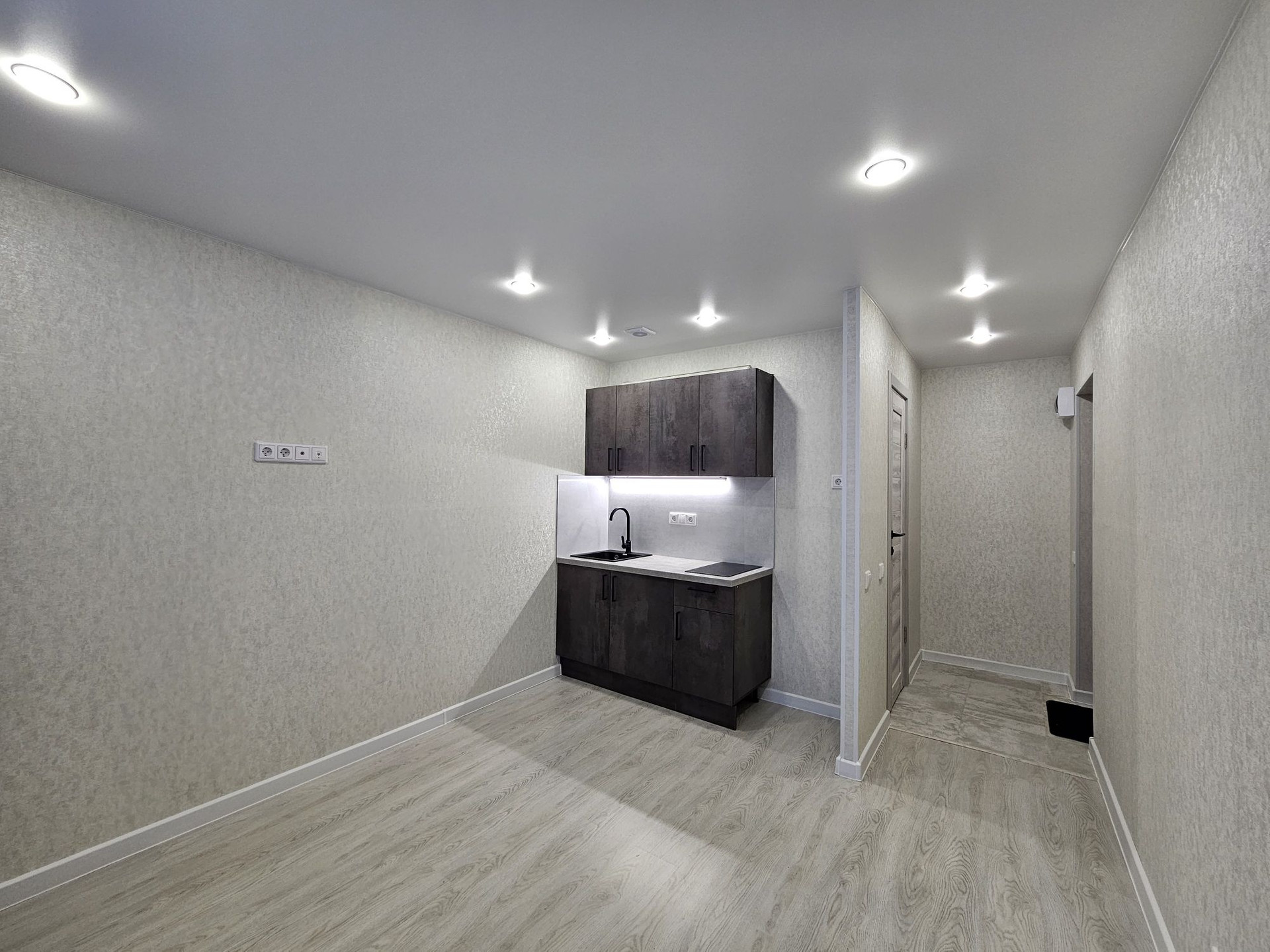 Выделена кухонная зона, куда установлен новый, встроенный кухонный гарнитур с варочной поверхностью и подсветкой, а справа от него оборудована ниша для холодильника!