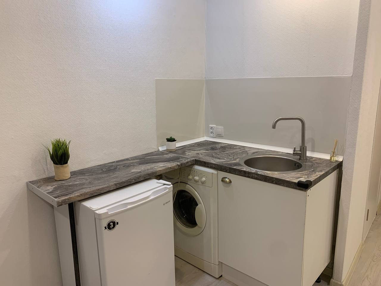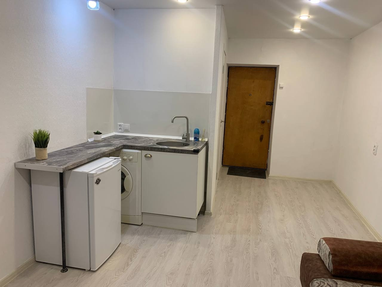 Студия полностью укомплектована, имеется: диван, кухня, холодильник, стиральная машина и санузел.