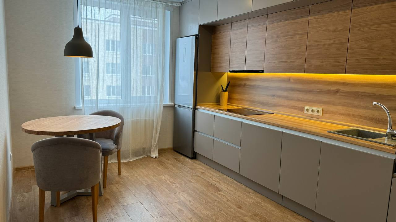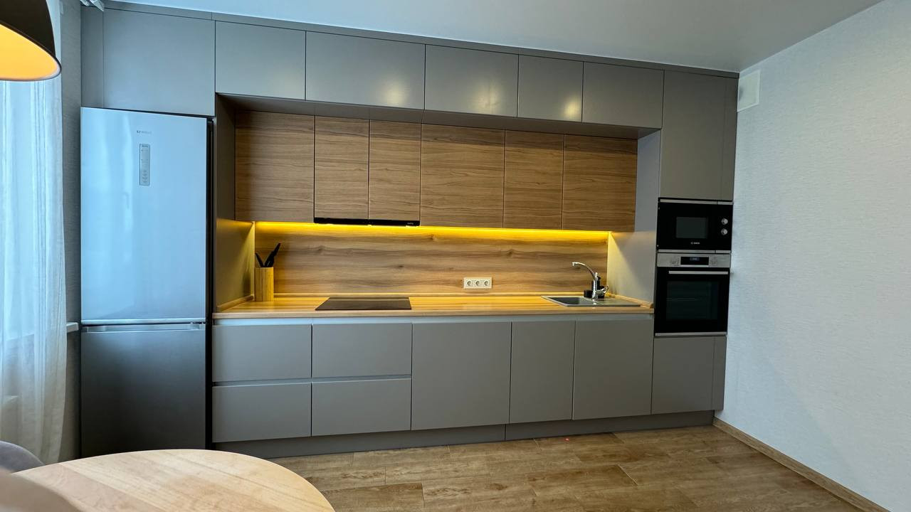 Качественная кухня со встроенной техникой, оборудованная дополнительной подсветкой.