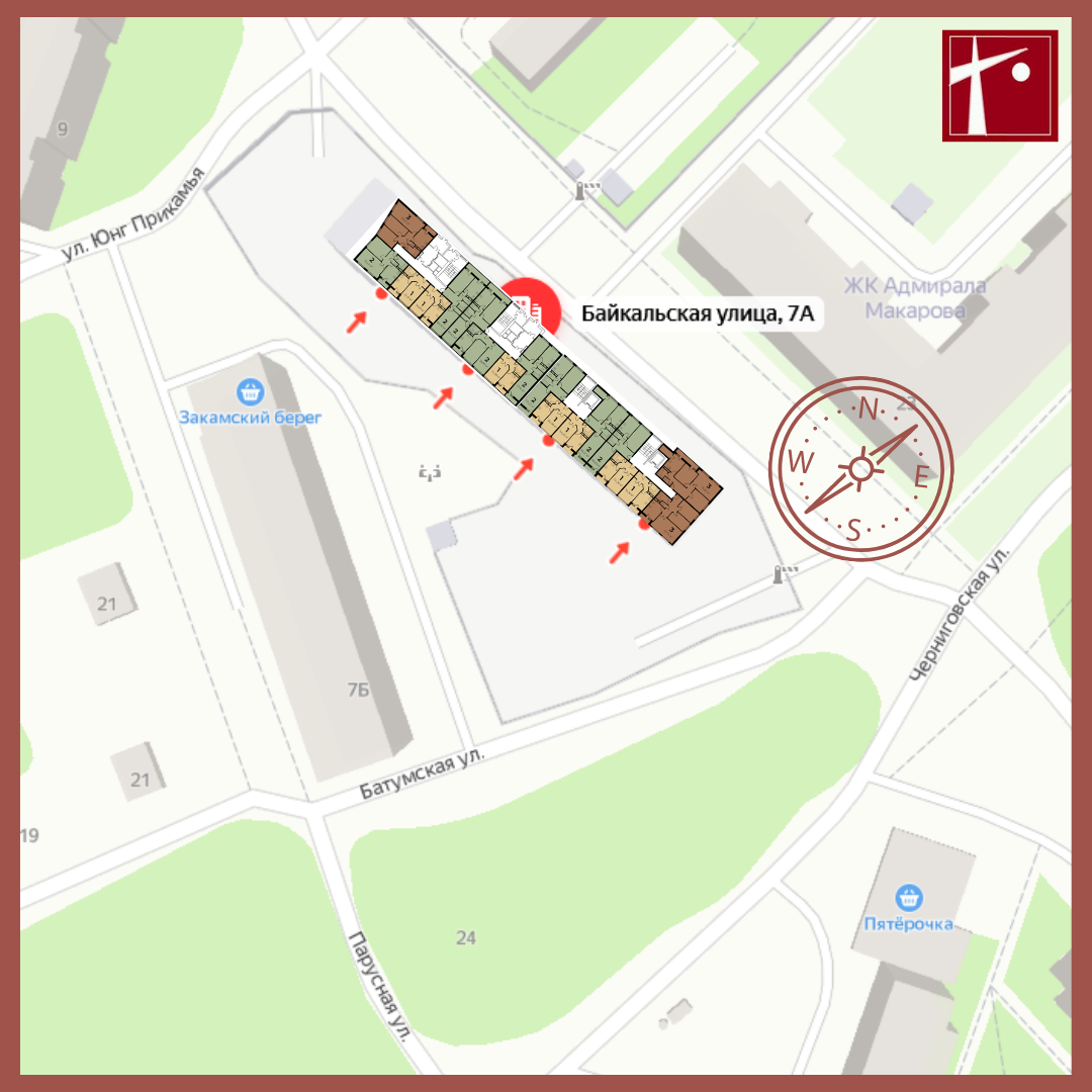 Дом расположен в квартале пересечения улиц Батумской, Байкальской, Юнг Прикамья и Парусной и является продолжением строительства комплекса домов на ул.Байкальской.