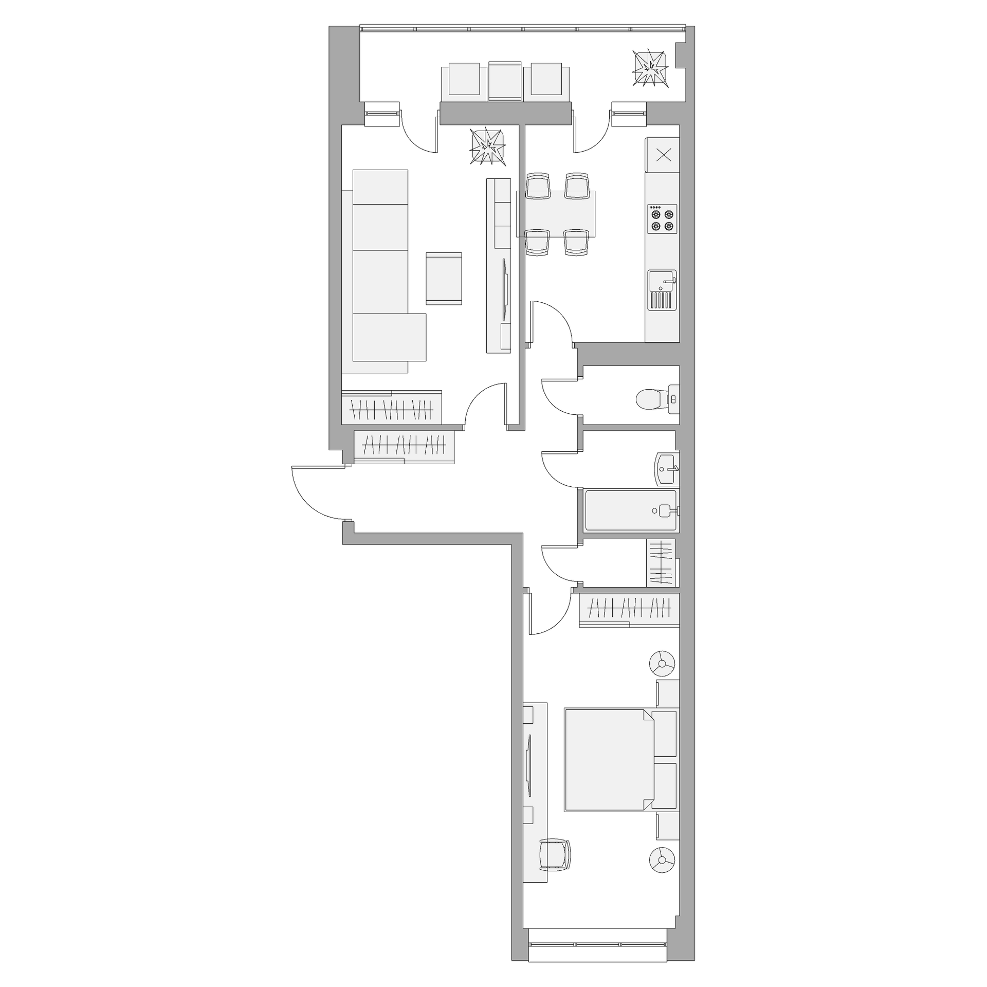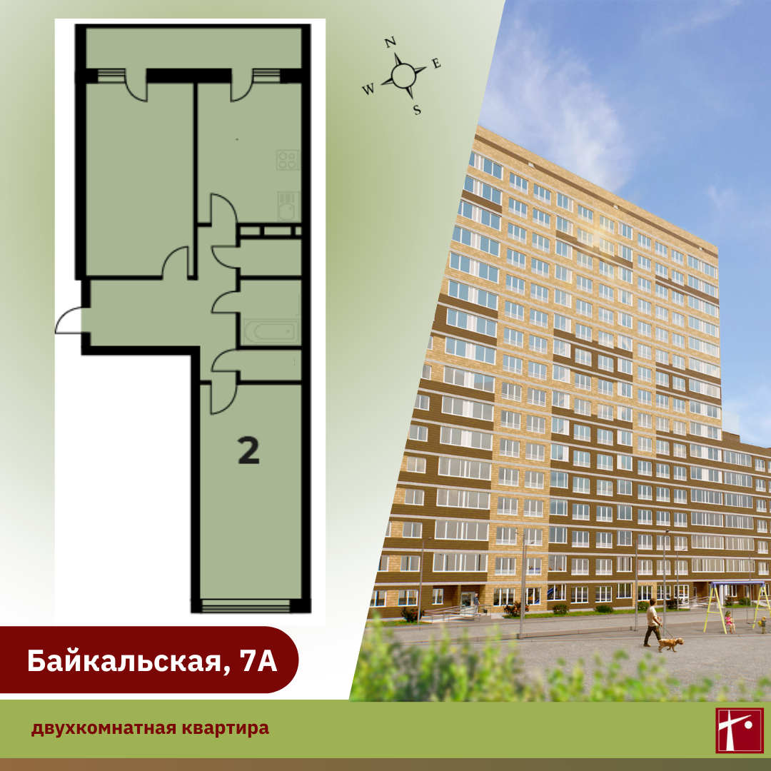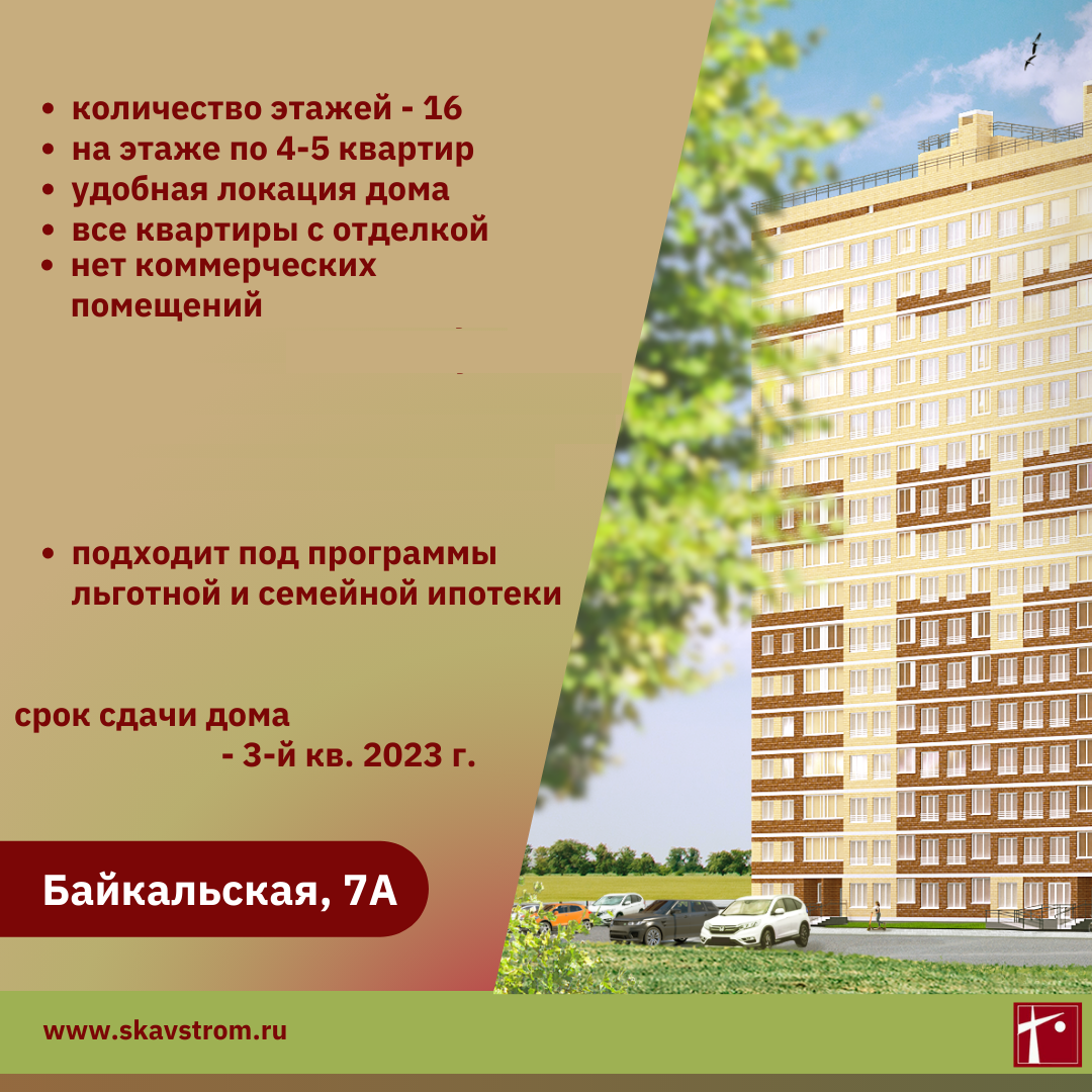 Квартиры на Байкальской, 7А с полной строительной отделкой: обои на стенах, линолеум на полу, натяжные потолки, сантехника установлена, приборы учета на ГВС, ХВС, электричество, отопление, входные двери – металлические, межкомнатные – ламинированные, на кухне – электроплиты, детские замки на окнах.