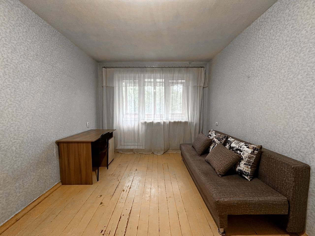 Жилая комната общей площадью 17.3 кв.м. с балконом с видом на тихий, зеленый двор.