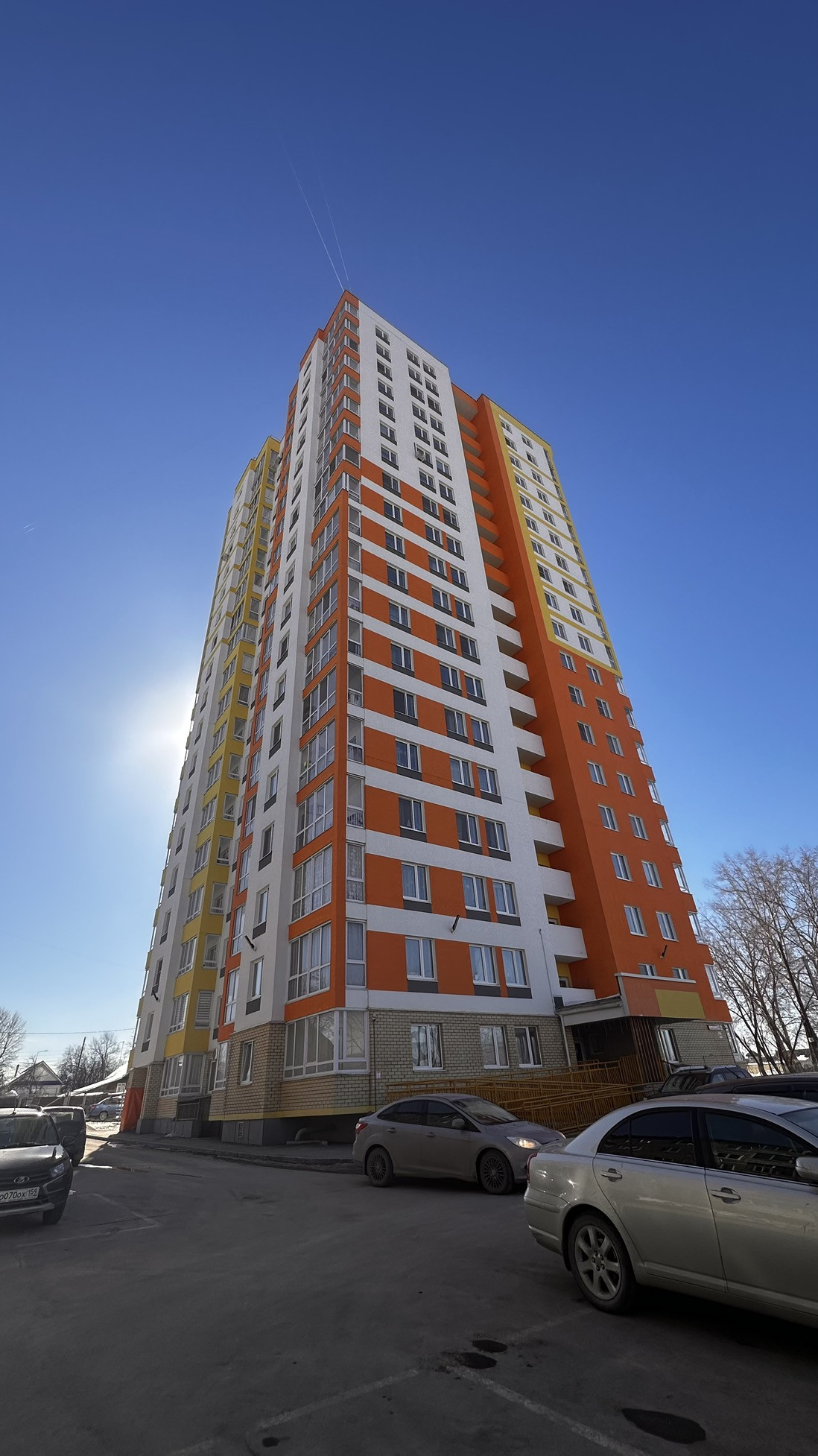 -облицовка первого этажа — керамический кирпич, со 2 по 19 этаж — штукатурка и фасадная краска.