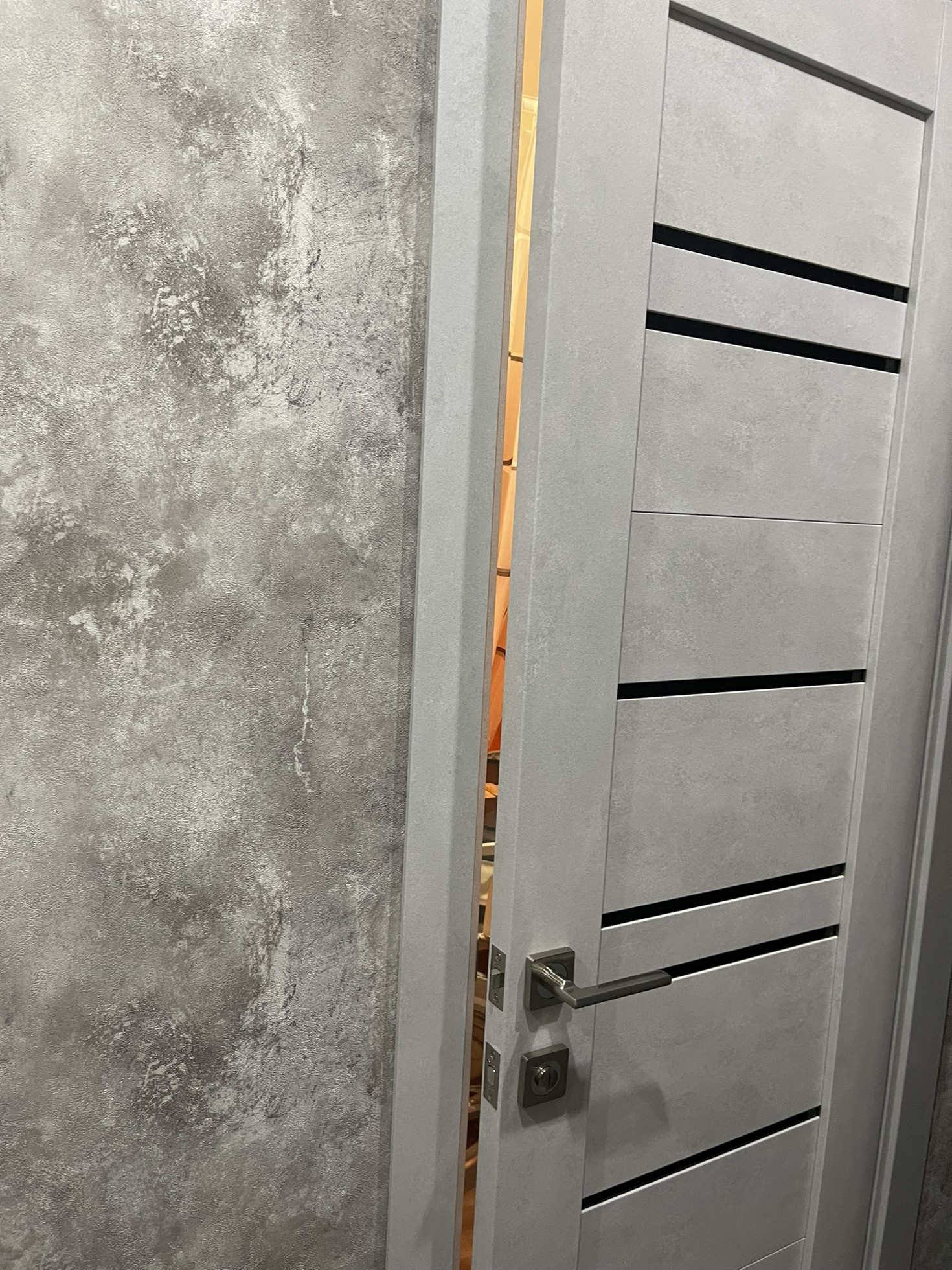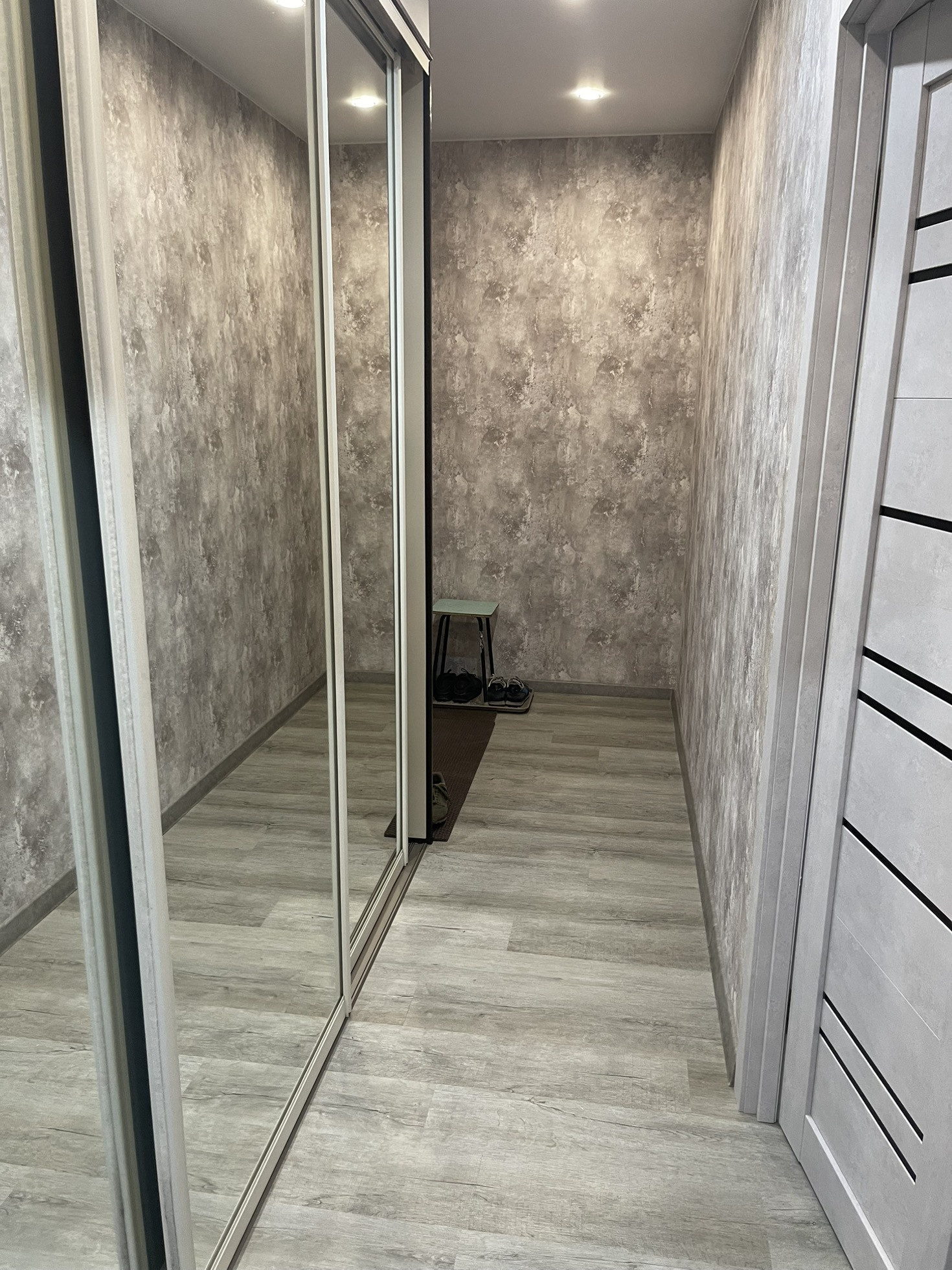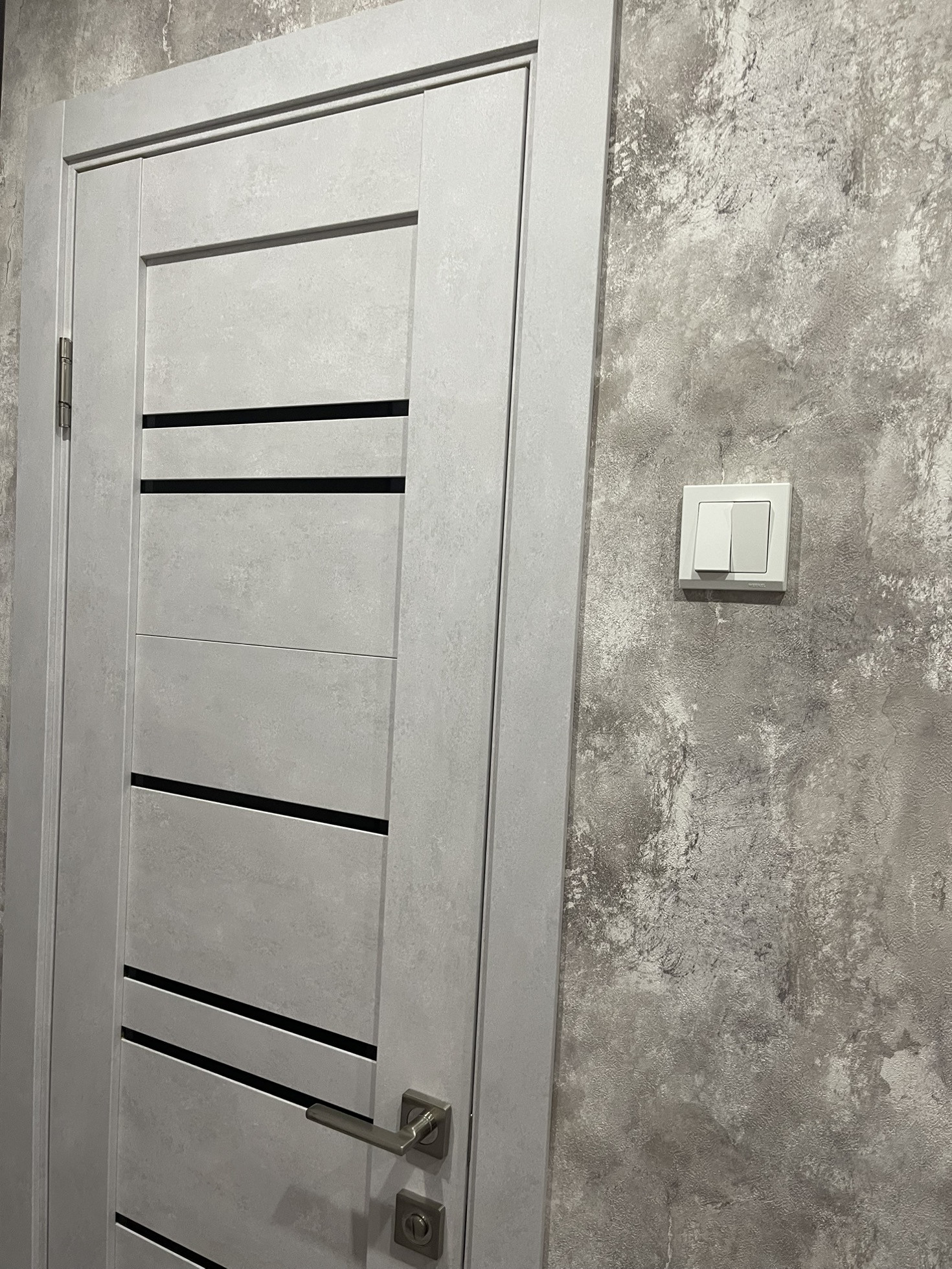 ✅ Поклеены обои нейтрального серого цвета.
