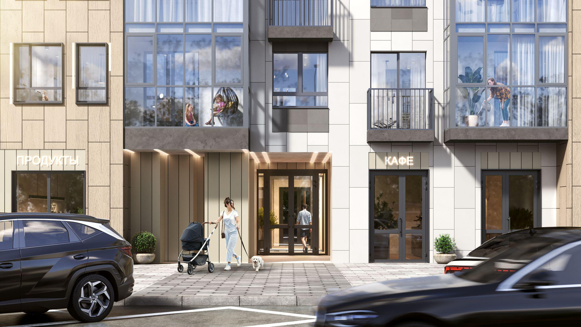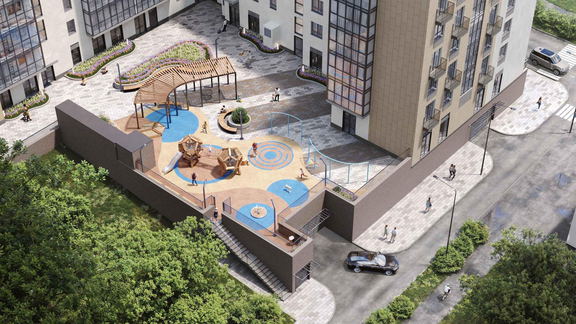 Закрытая территория дома и площадки для разных групп.