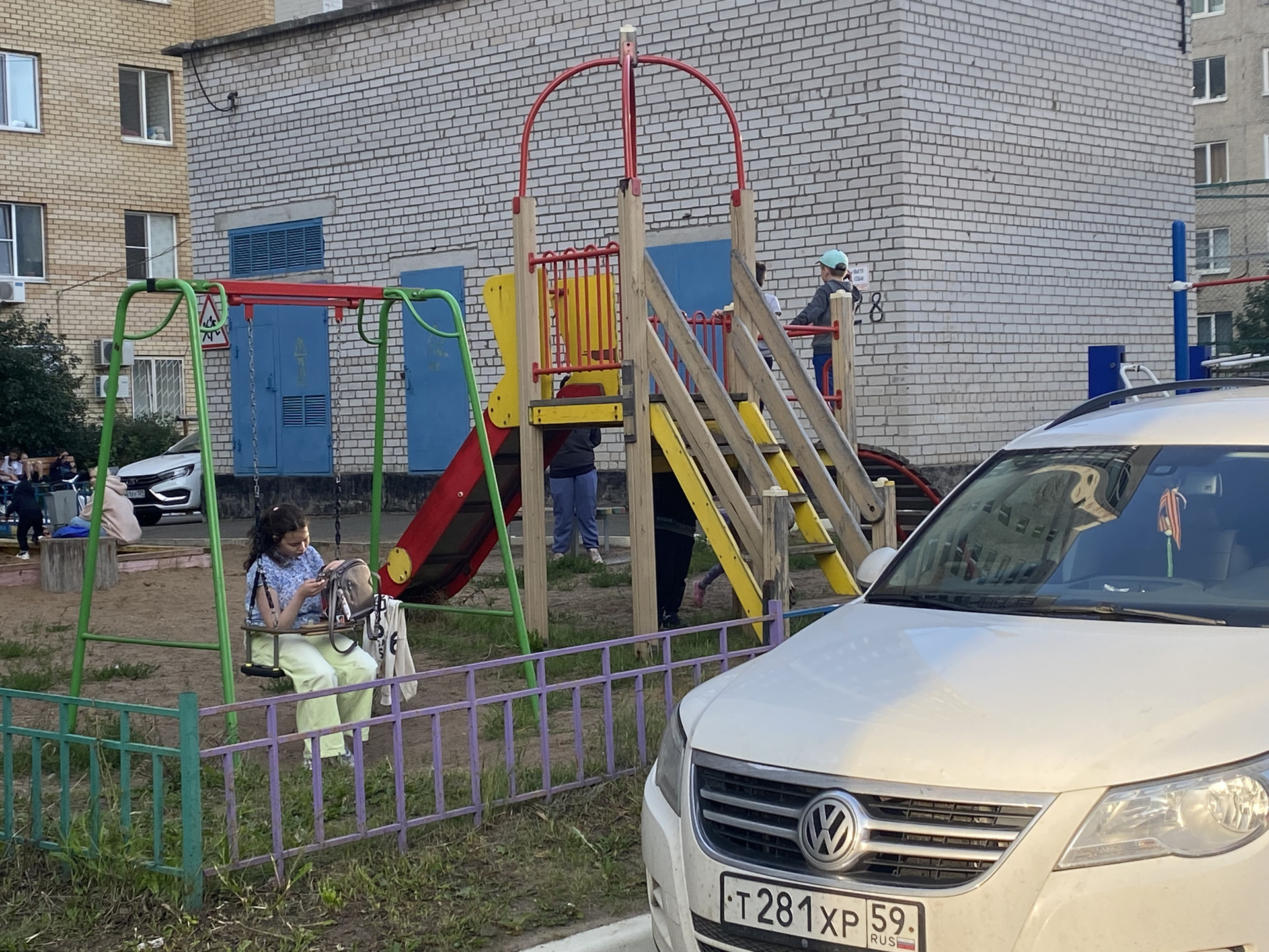 Ухоженный зеленый двор с детской площадкой.