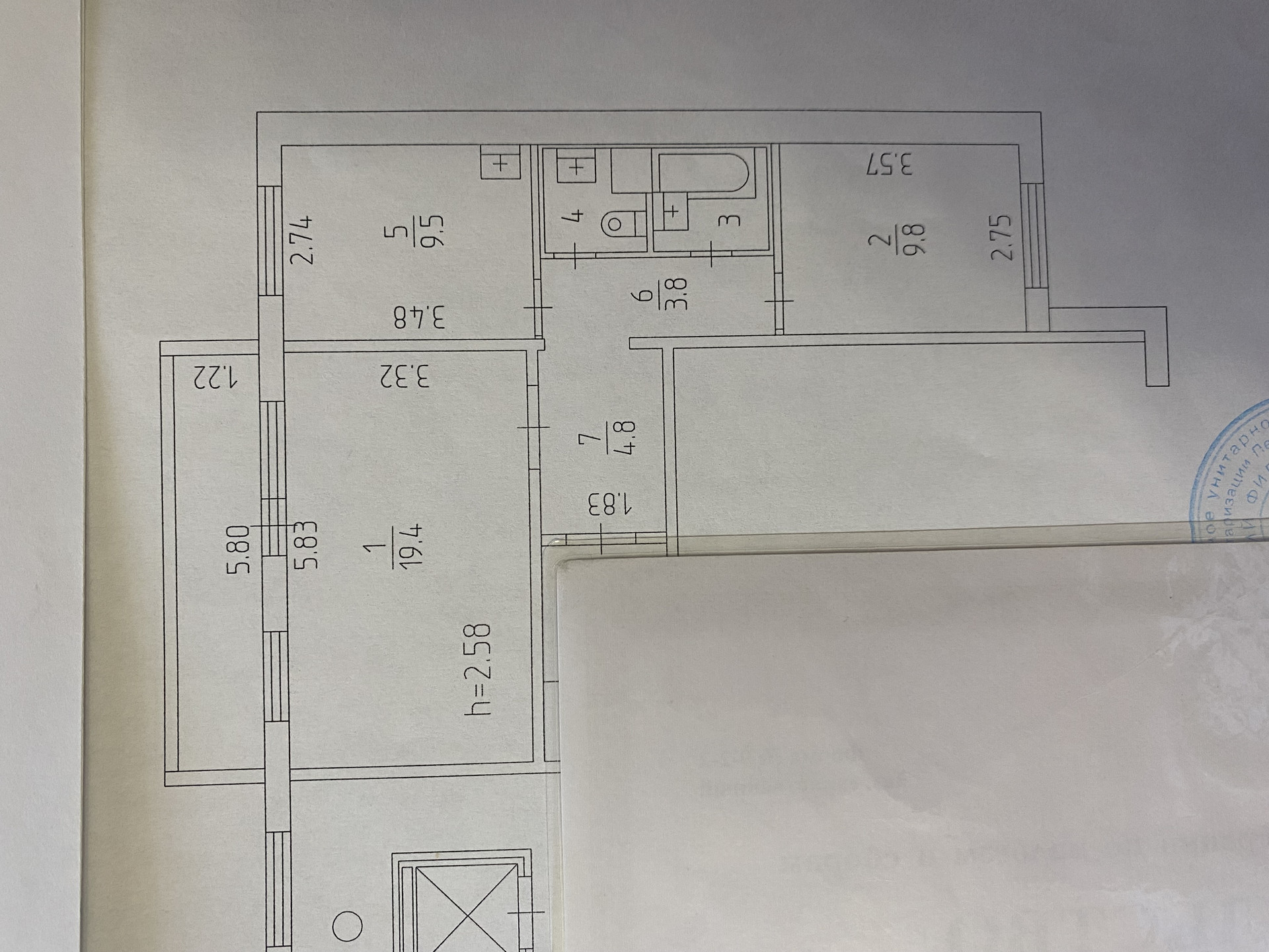 Квартира общей площадью 51,6 м2, находится на комфортном 7 этаже, две жилые раздельные комнаты - 19,4 м2 с выходом на большую лоджию – 7 м2 и спальня - 9,8 м2, кухня – 9,5 м2, просторные коридоры – 3,8 м2 и 4,8 м2, раздельные ванная- 2.5 м2 и санузел 1,8 м2, где размещена стиральная машина.