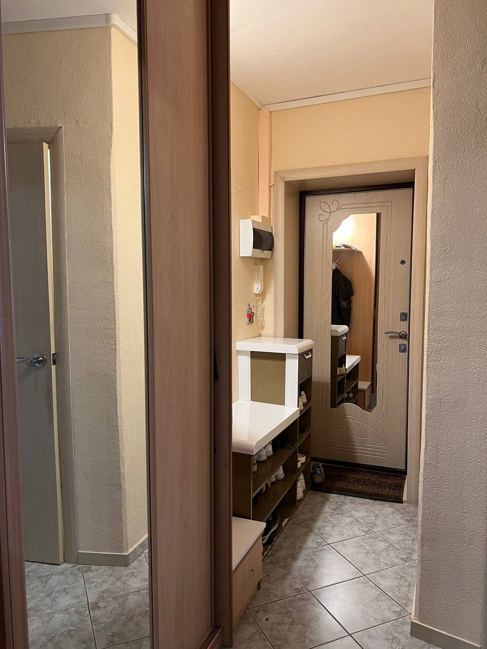 В коридоре встроенный шкаф и полочка под обувь так же остаются. Входная дверь с зеркалом.