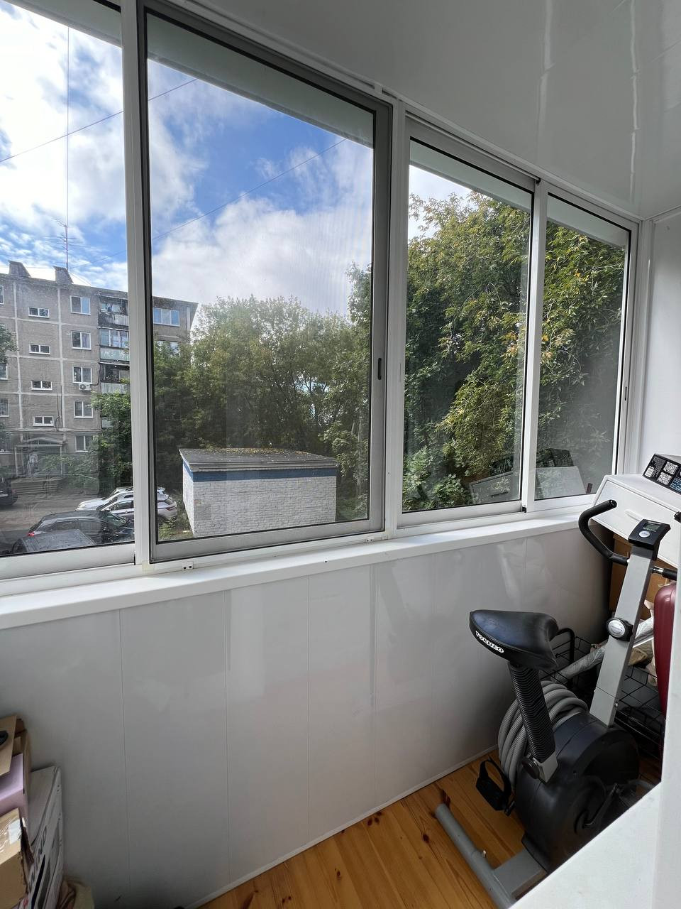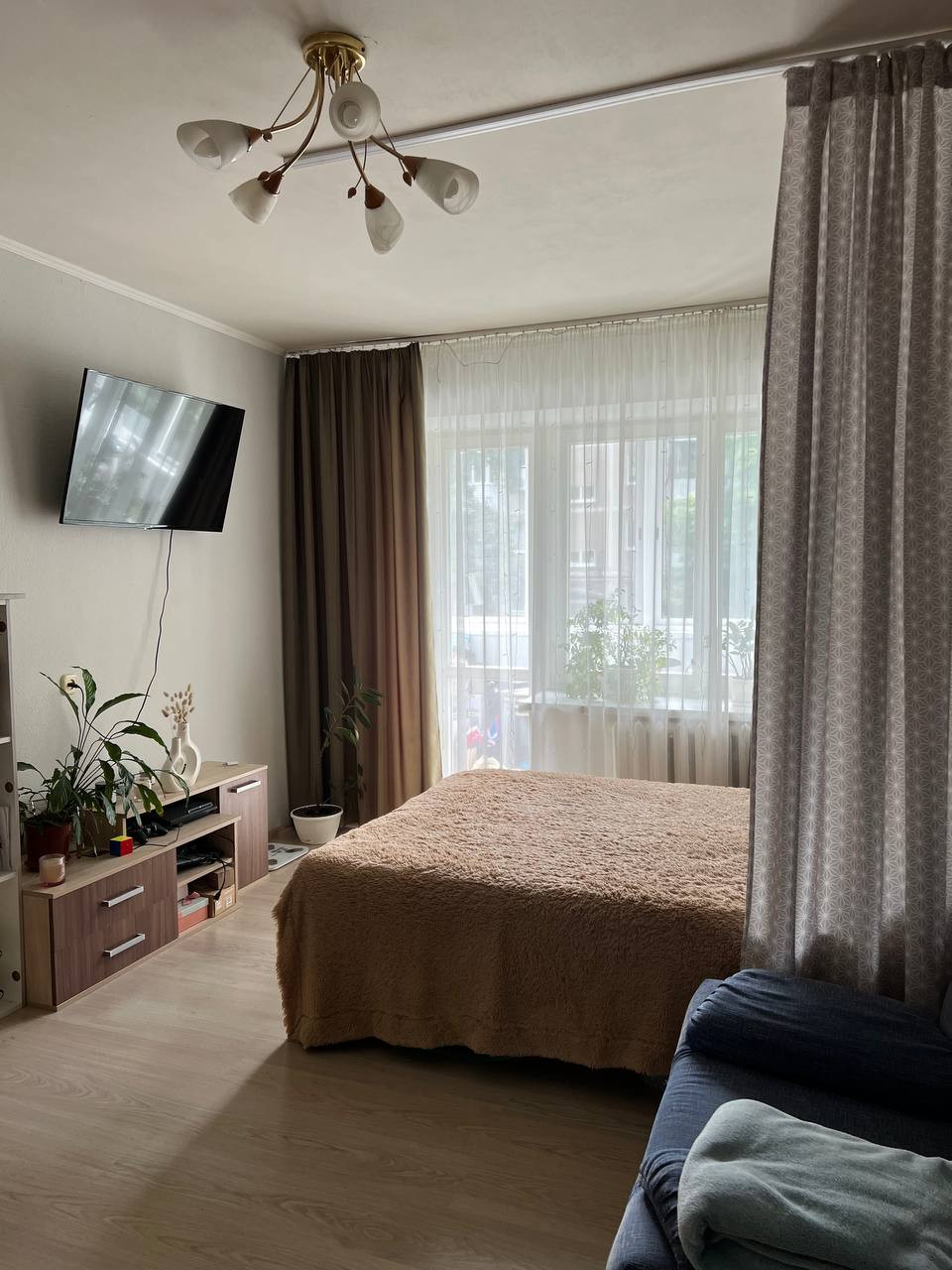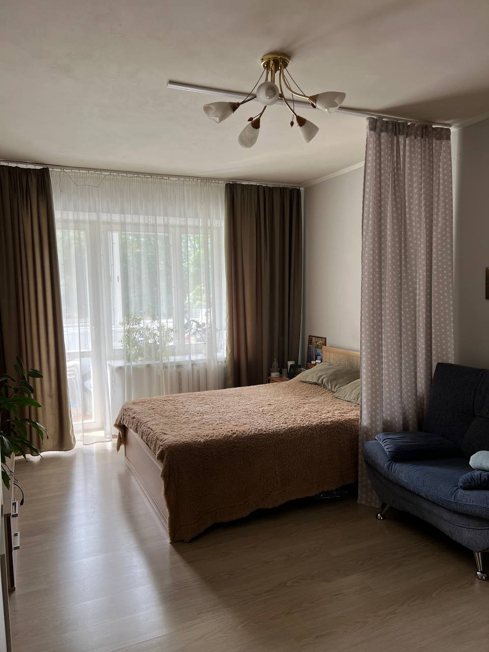 Балкон застеклён, окна в комнате и на кухне – деревянные стеклопакеты.