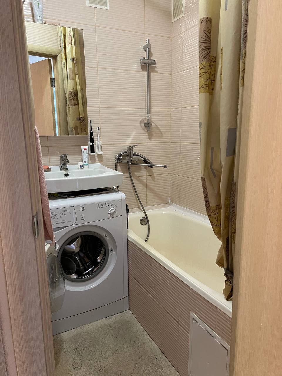 Санузел раздельный – в ванной плитка, в туалете обои, в туалете вместительный шкаф (убрать/переделать под себя). Стиральную машинку тоже оставляем.