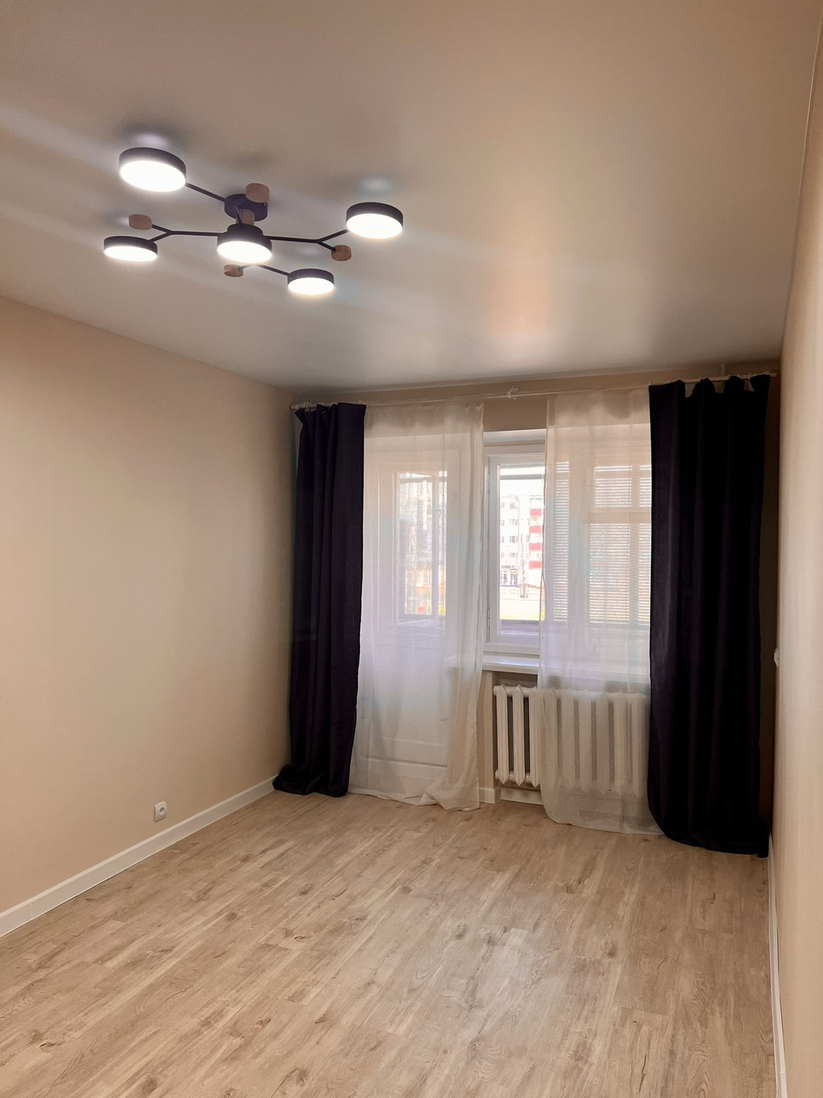 Новый ремонт: новые двери, выровнены полы, выровнены стены, ламинат, подвесные потолки, новый вместительный кухонный гарнитур, сантехника, шторы, частично мебель. После ремонта никто не жил.