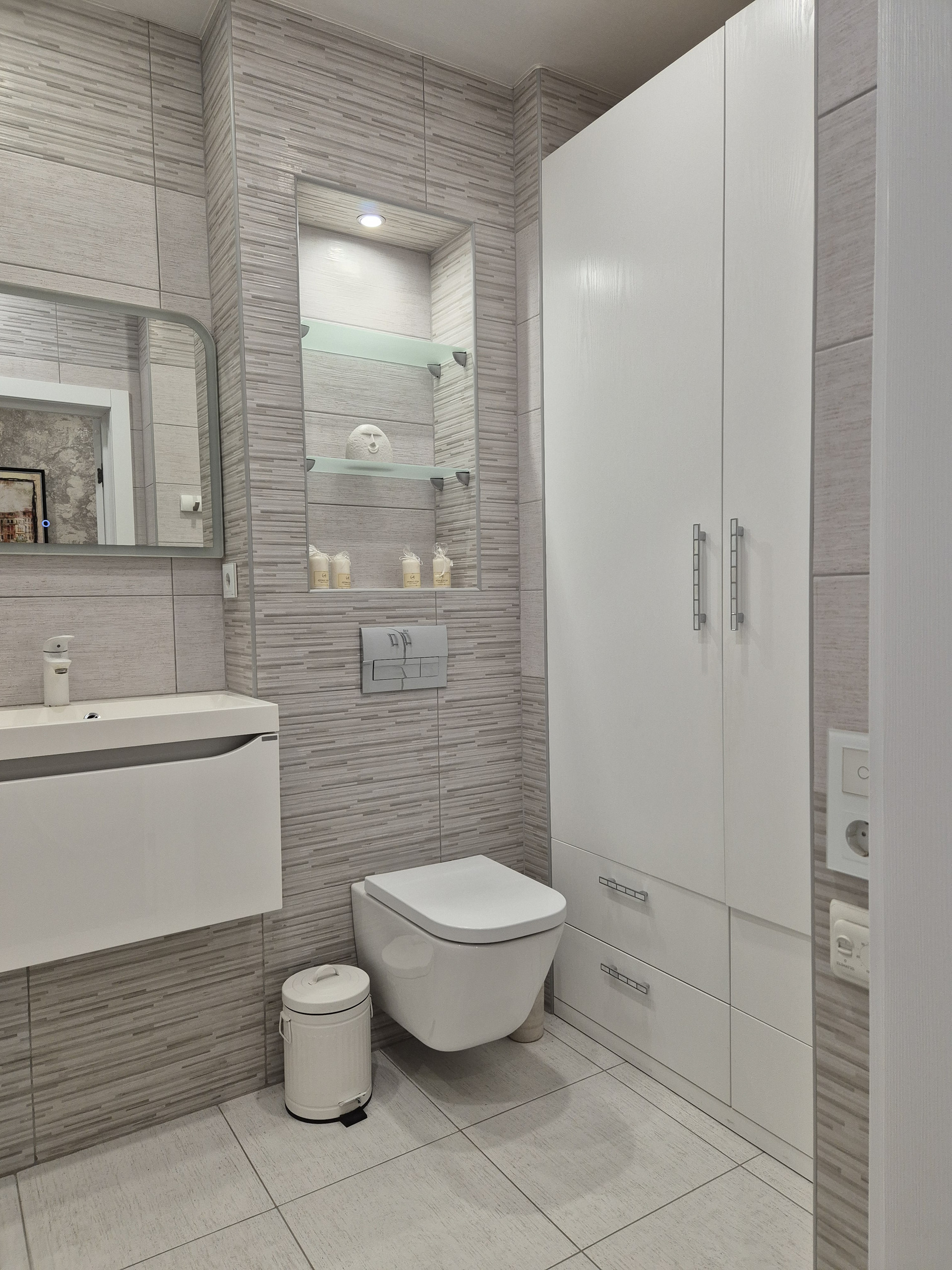 - в сан узлах - плитка, новая сантехника, в сан узле установлена система тёплый пол и т.д.