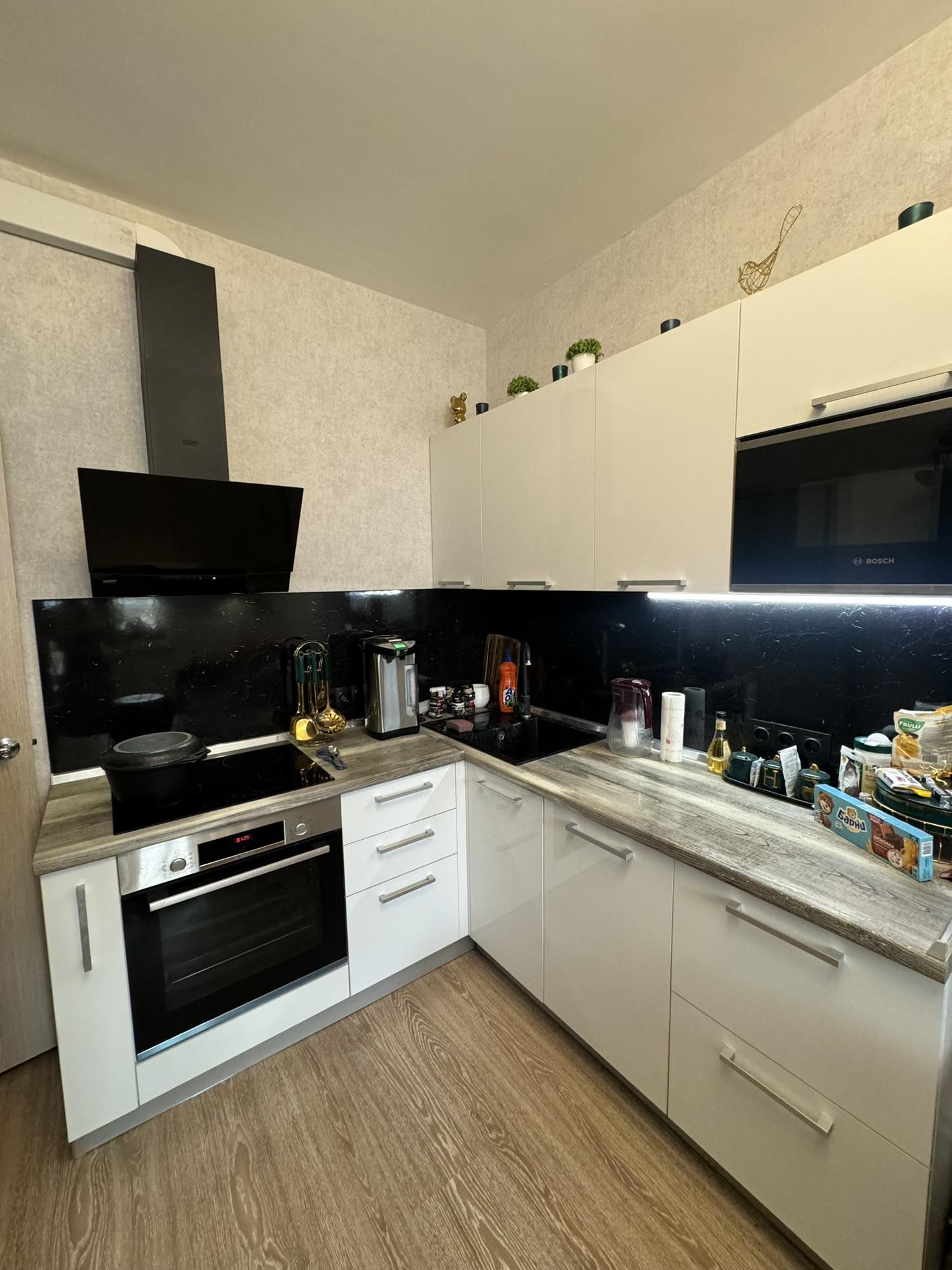 Большая кухня (13 кв. м) с выходом на лоджию. Остается дорогой кухонный гарнитур с качественной техникой: встроенная посудомоечная машина и вытяжка. Жилая комната: 19 кв. м., большой вместительный коридор с встроенным зеркальным шкафом-купе (который остается). Просторный санузел в котором поменяны трубы, полотенце-сушитель, на полу и стенах плитка, заметьте плитка в потолок, дополнительно установлены полки под хранение. На полу во всей квартире ламинат. В квартире очень тепло зимой.