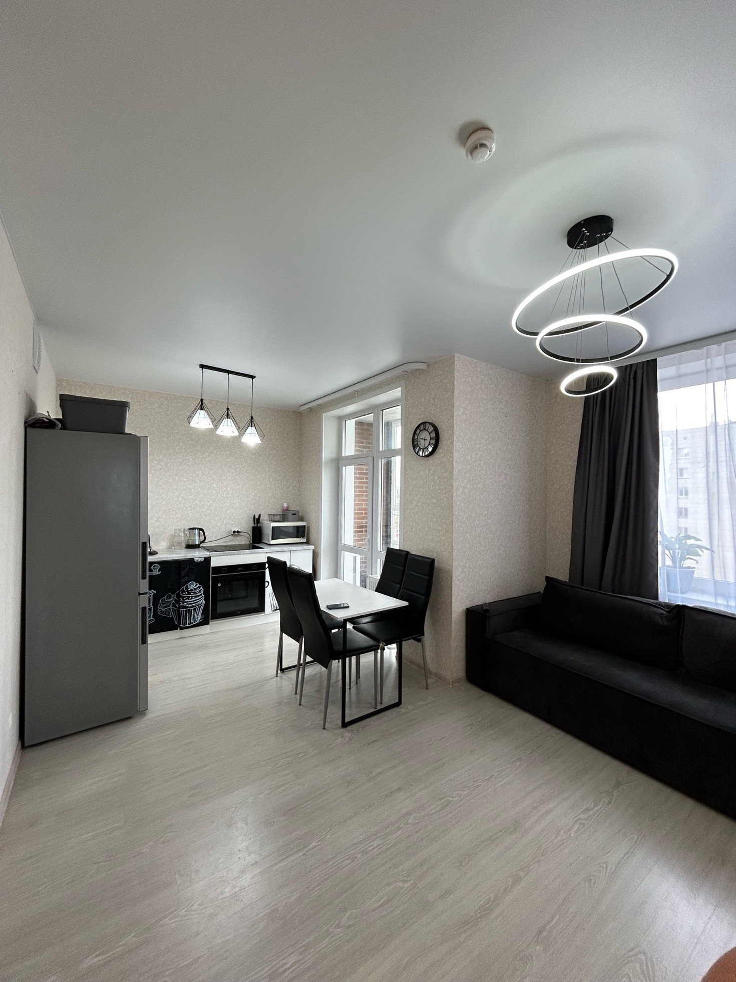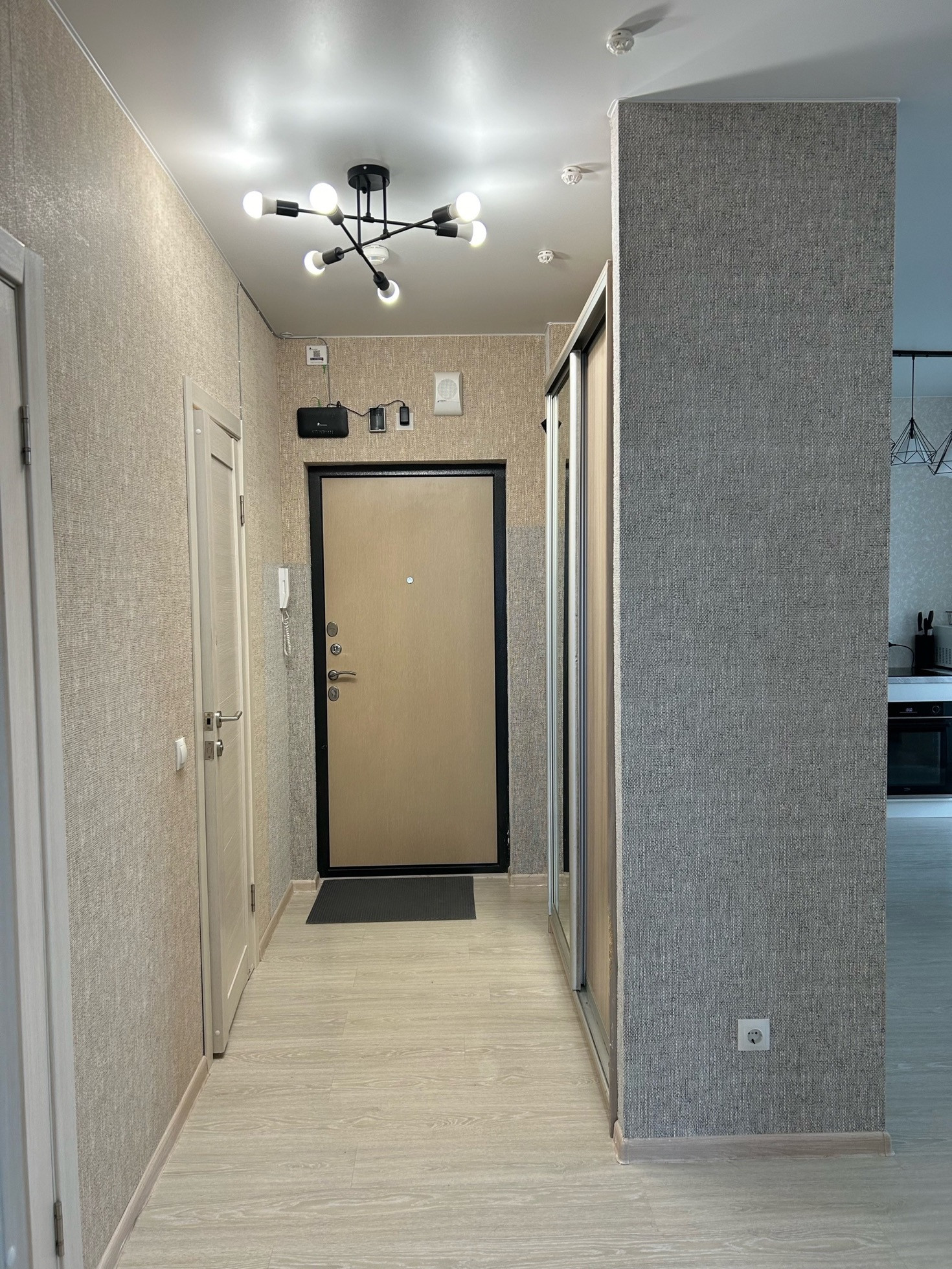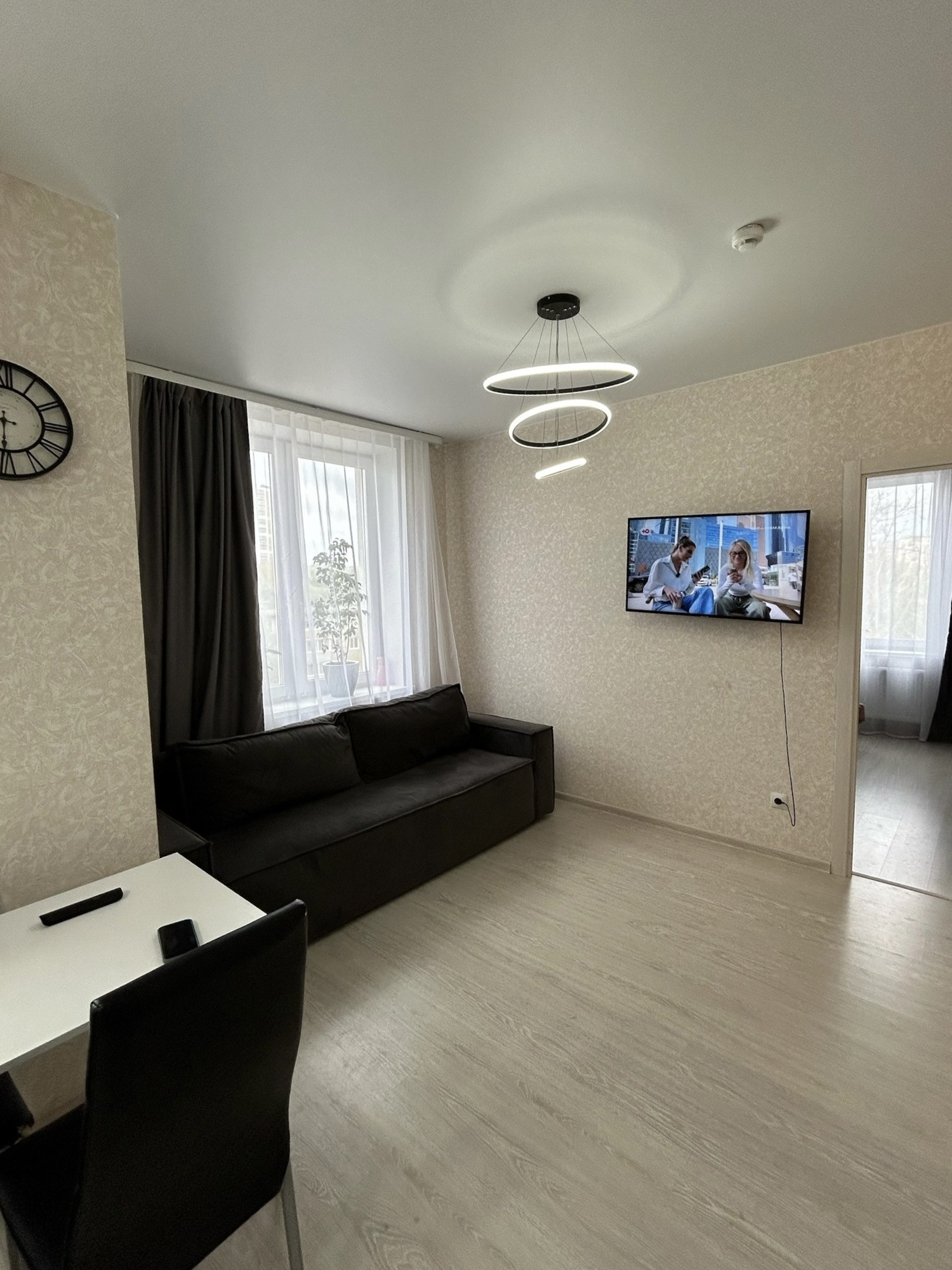 В квартире остается: люстры, кухонный гарнитур, шкаф-купе в прихожей, раковина с тумбой, гардины.