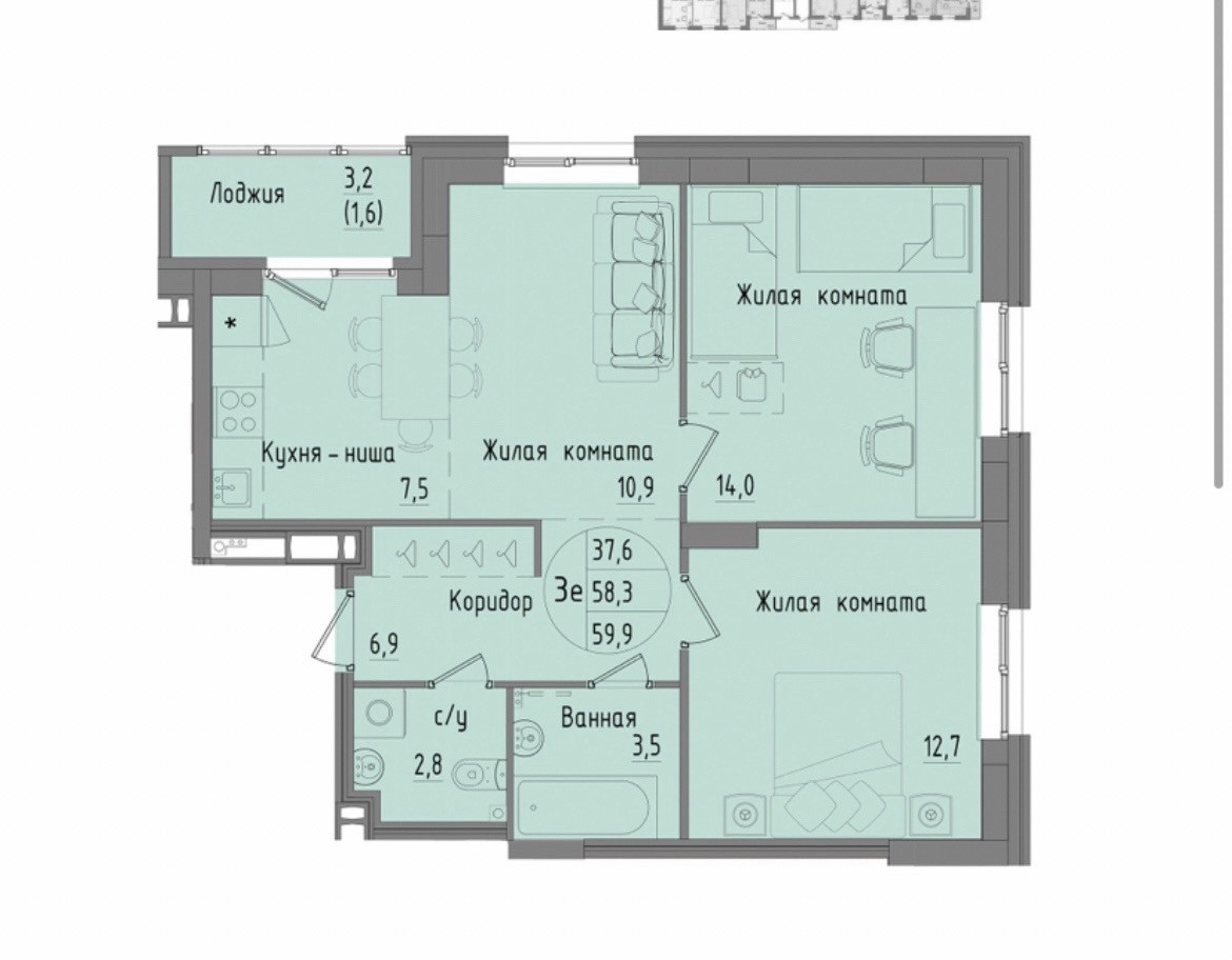 Общая площадь 59.9 м2