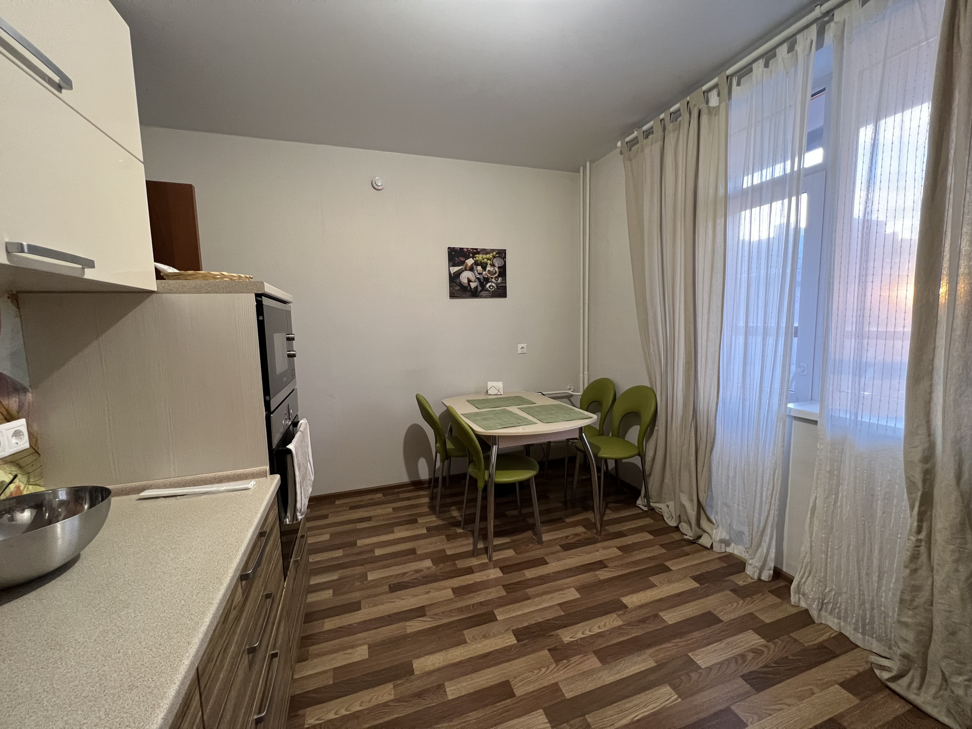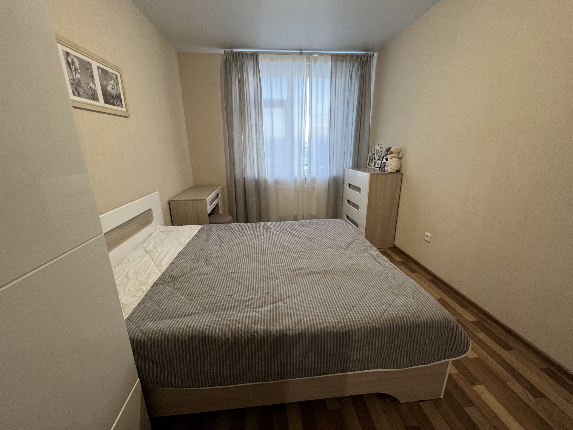 Ремонт от застройщика. Квартира полностью мебелирована: спальня с туалетным столиком, шкафом и комодом, гостиная с большим диваном, а также кухня с качественным гарнитуром. Оставляем бытовую технику преимущественно марки Bosch: посудомоечную машину, холодильник, индукционную варочную панель, вытяжку, духовой шкаф, микроволновую печь и даже два пылесоса - ручной и робот. В санузле есть стиральная машина, в гостиной - кондиционер с функциями обогрева (которой мы ни разу не пользовались - не мерзли) и осушения.