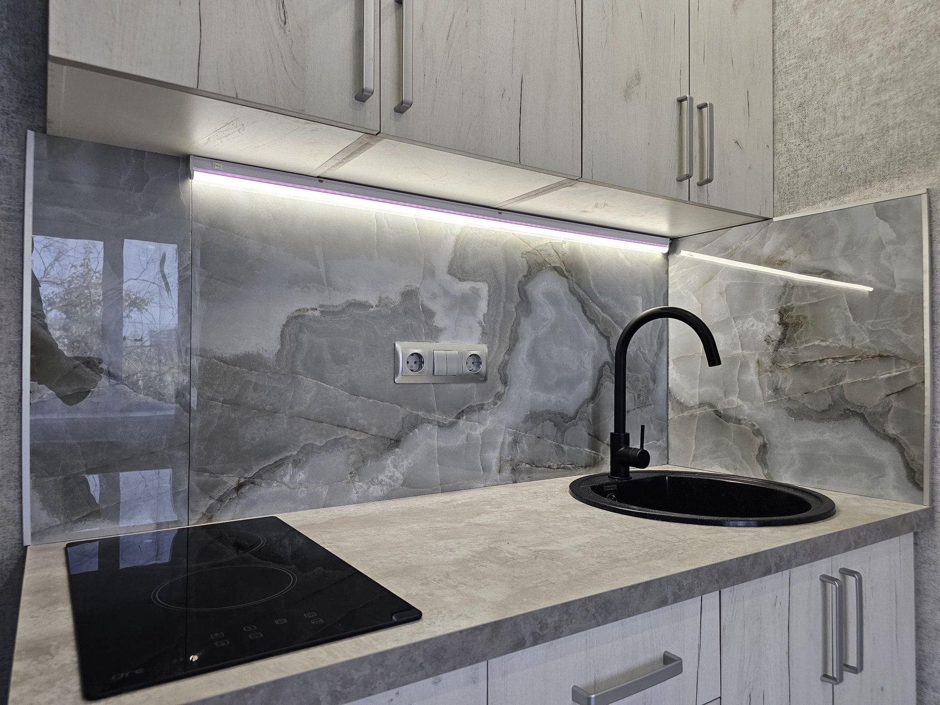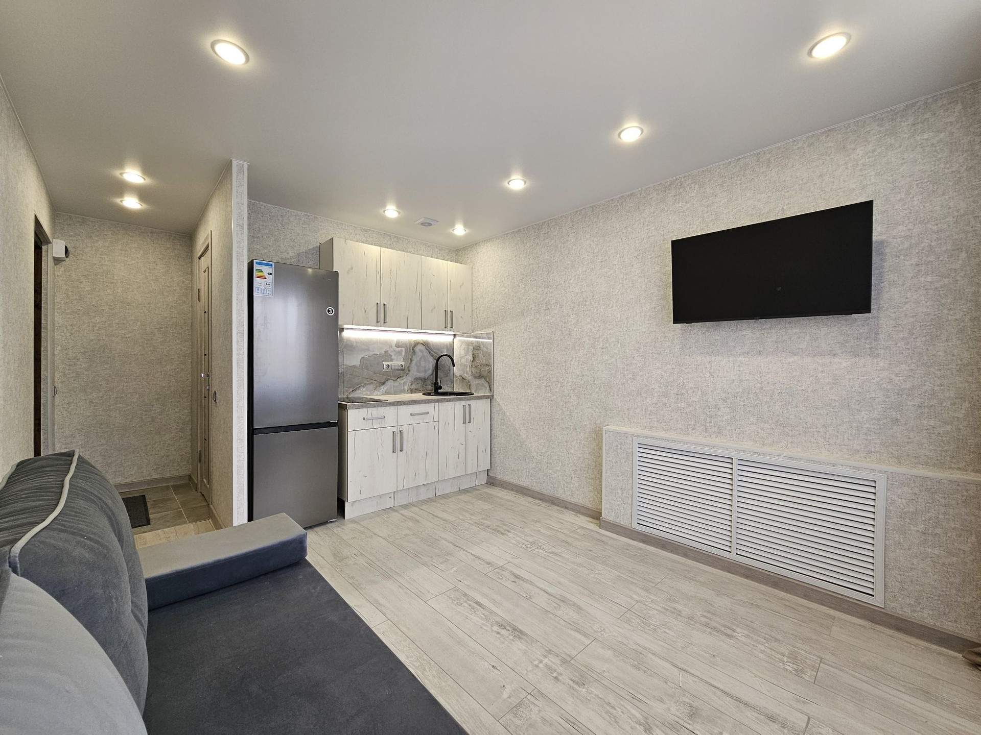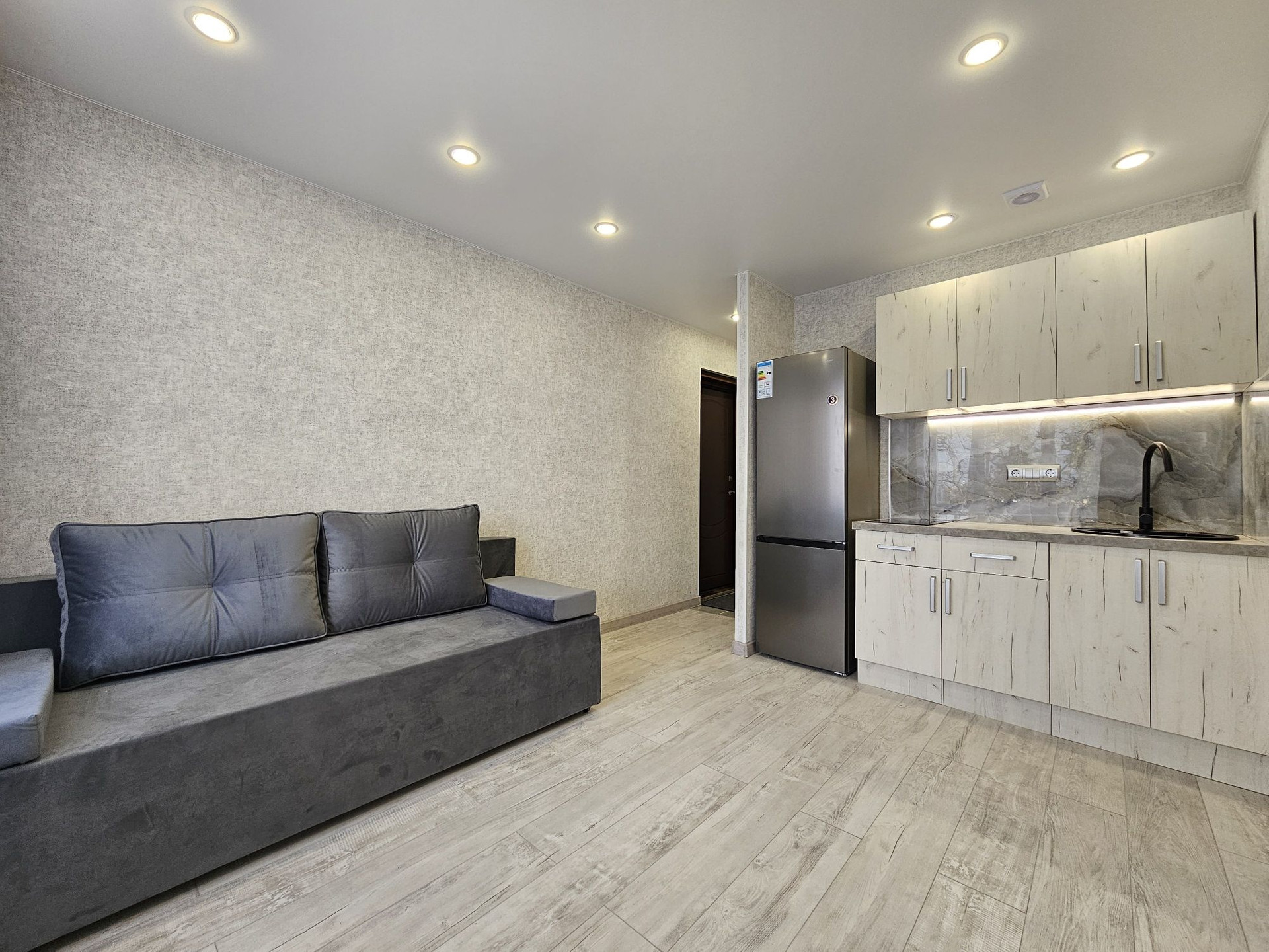 Выделена кухонная зона, куда установлен новый, встроенный кухонный гарнитур с варочной поверхностью и подсветкой, а слева от него оборудована ниша под холодильник и сам холодильник.
