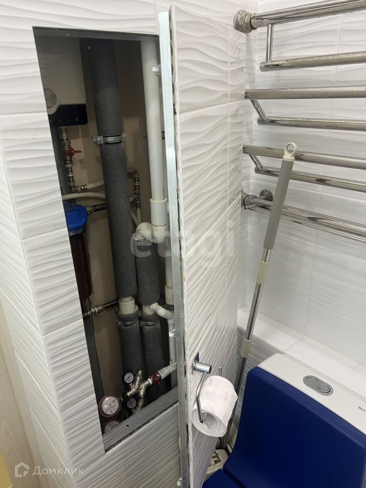 Санузел совмещен: стены, пол в керамограните, установлен проточный водонагреватель и фильтрация для воды, все это спрятано в коробе под скрытым люком и плиткой. Душевая система скрытого монтажа с тропическим душем. Качественная большая чугунная ванна Rоса 180х70 (Испания) , а так же унитаз Rоса (Испания) с кожаной обивкой.
