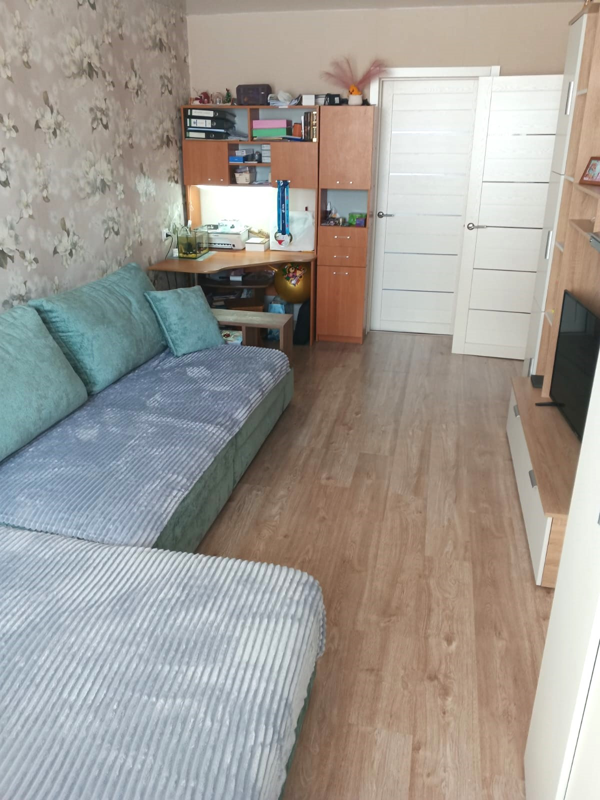 Состояние квартиры отличное! Комнаты площадью 18,5+13,0+12,6 кв.м., на разные стороны дома, одна изолирована, две смежные. В квартире натяжные потолки с точечными светильниками, на полу ламинат во всей квартире, в кухне линолеум, современные межкомнатные двери, обои нейтральных оттенков. В санузле кафель, в туалете установлен гигиенический душ. Лоджия и балкон остеклены пластиковыми окнами. В квартире оставляем кухонный гарнитур с варочной газовой поверхностью, возможно оставим электрический духовой шкаф и посудомоечную машину. Также остаются встроенные шкафы.