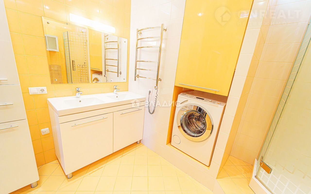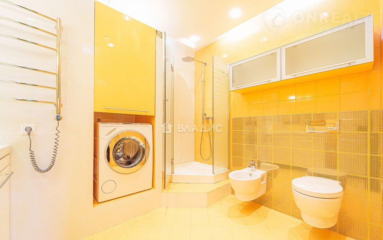 Сантехника от французских, немецких и итальянских брендов. В мастер-санузле смонтирована инсталляция для унитаза и биде. Много систем хранения, в том числе, для стиральной машины.