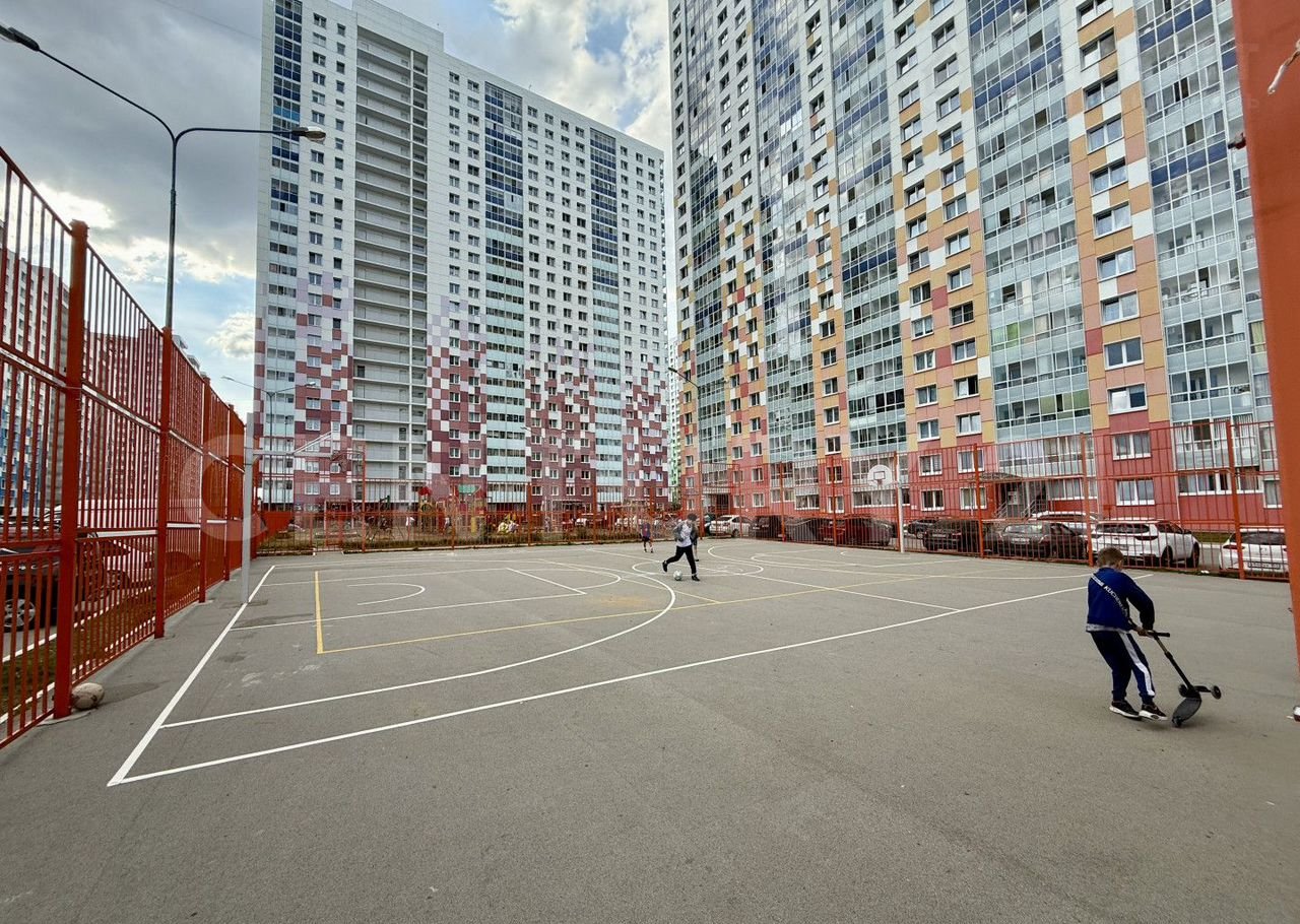 Ландшафтный дизайн и современные детские и баскетбольные площадки во дворе.