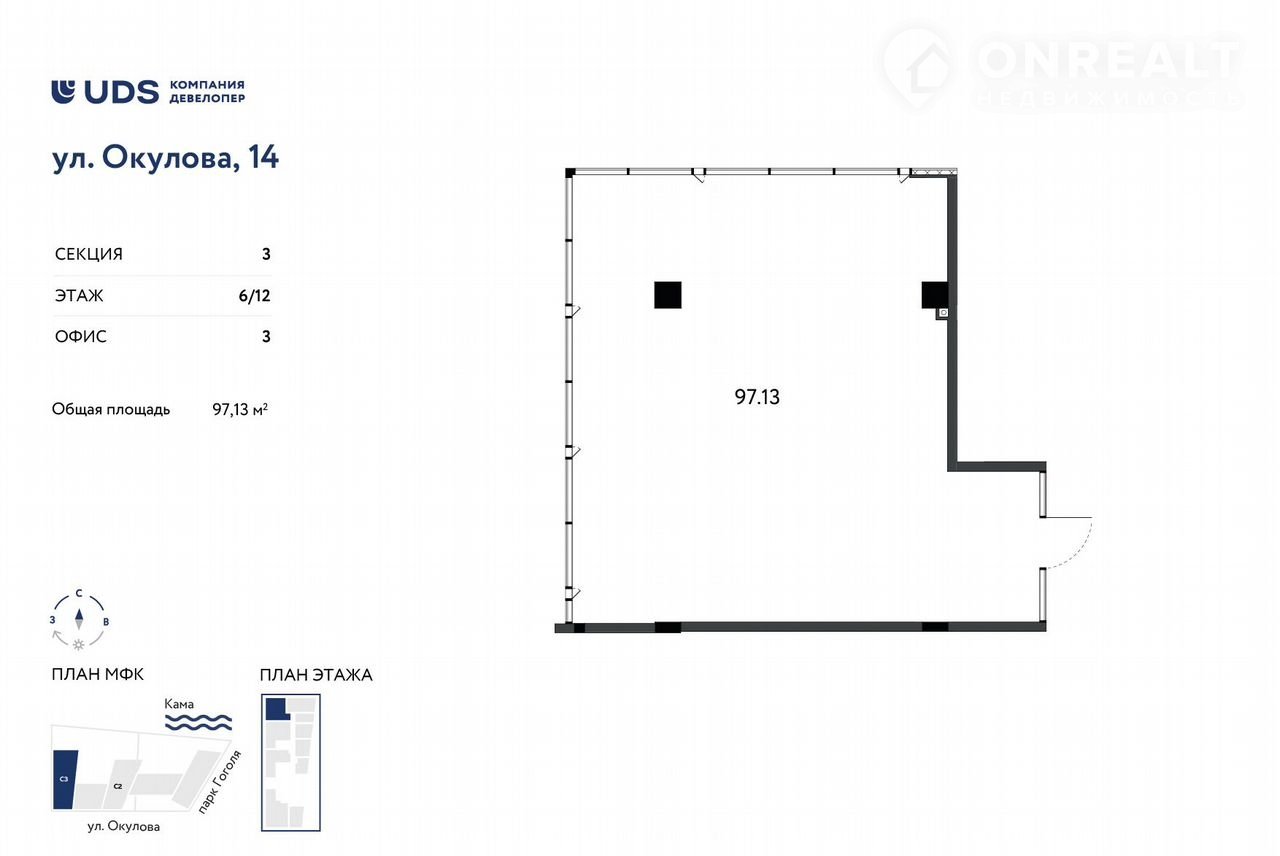 Пoмещeниe пoд офиc 97 м2 c видом на Каму, нa 6 этажe МФK Окулoвa 14 oт UDS.