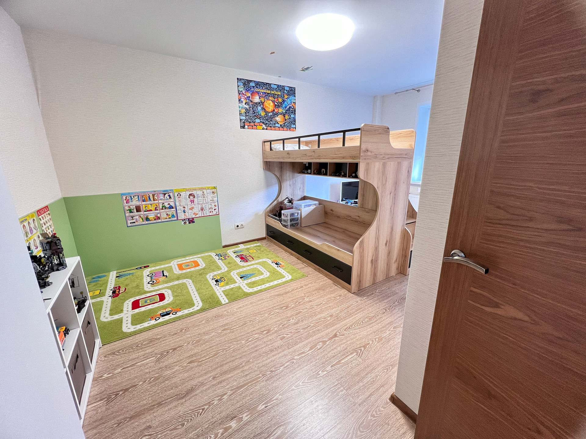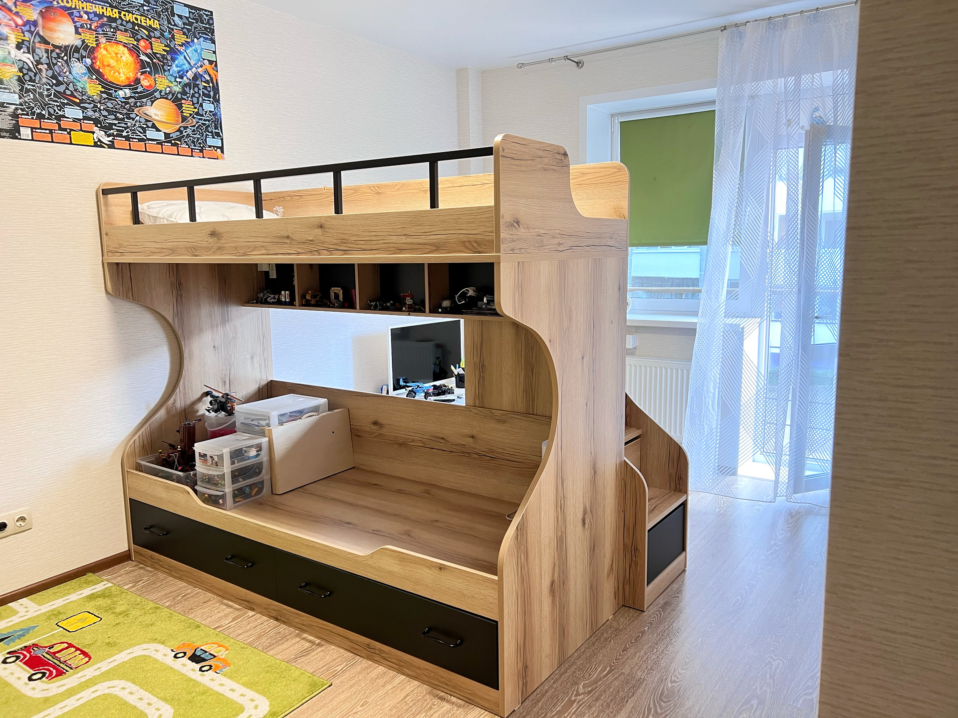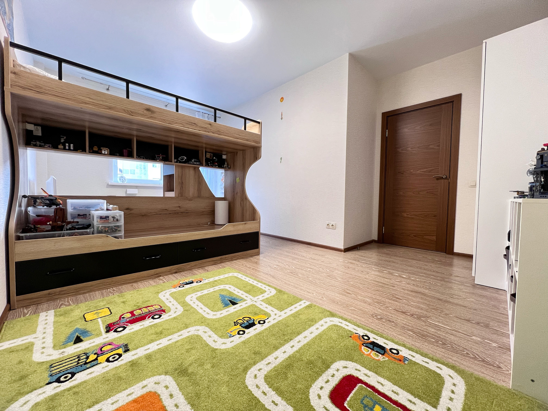 2 этаж •СПАЛЬНАЯ-детская с выходом на балконом: Встроенный шкаф и открытые полочки белого цвета, двухъярусная кровать с двумя матрацами •КАБИНЕТ с выходом на балкон: стеклянный рабочий стол под компьютер, кресло.