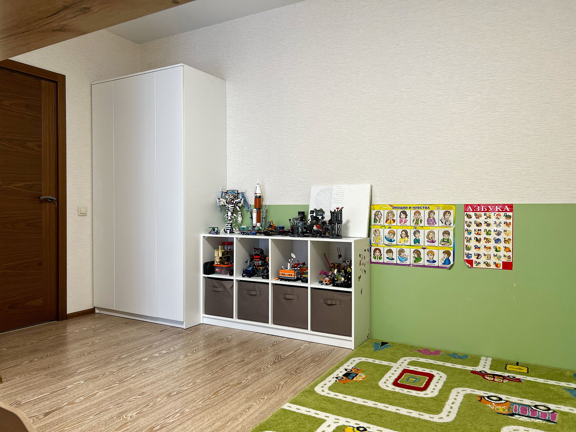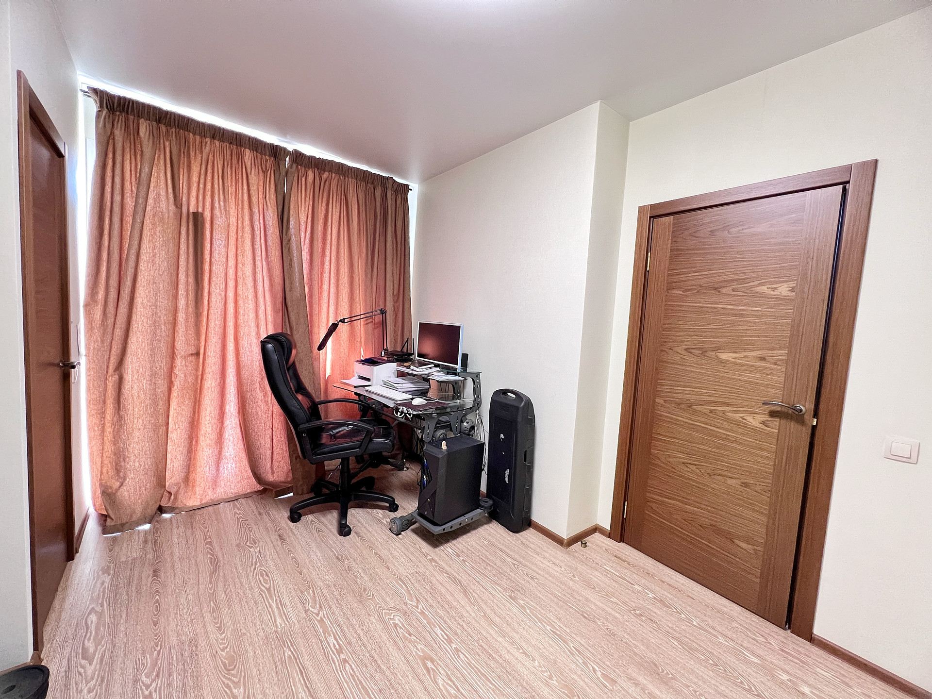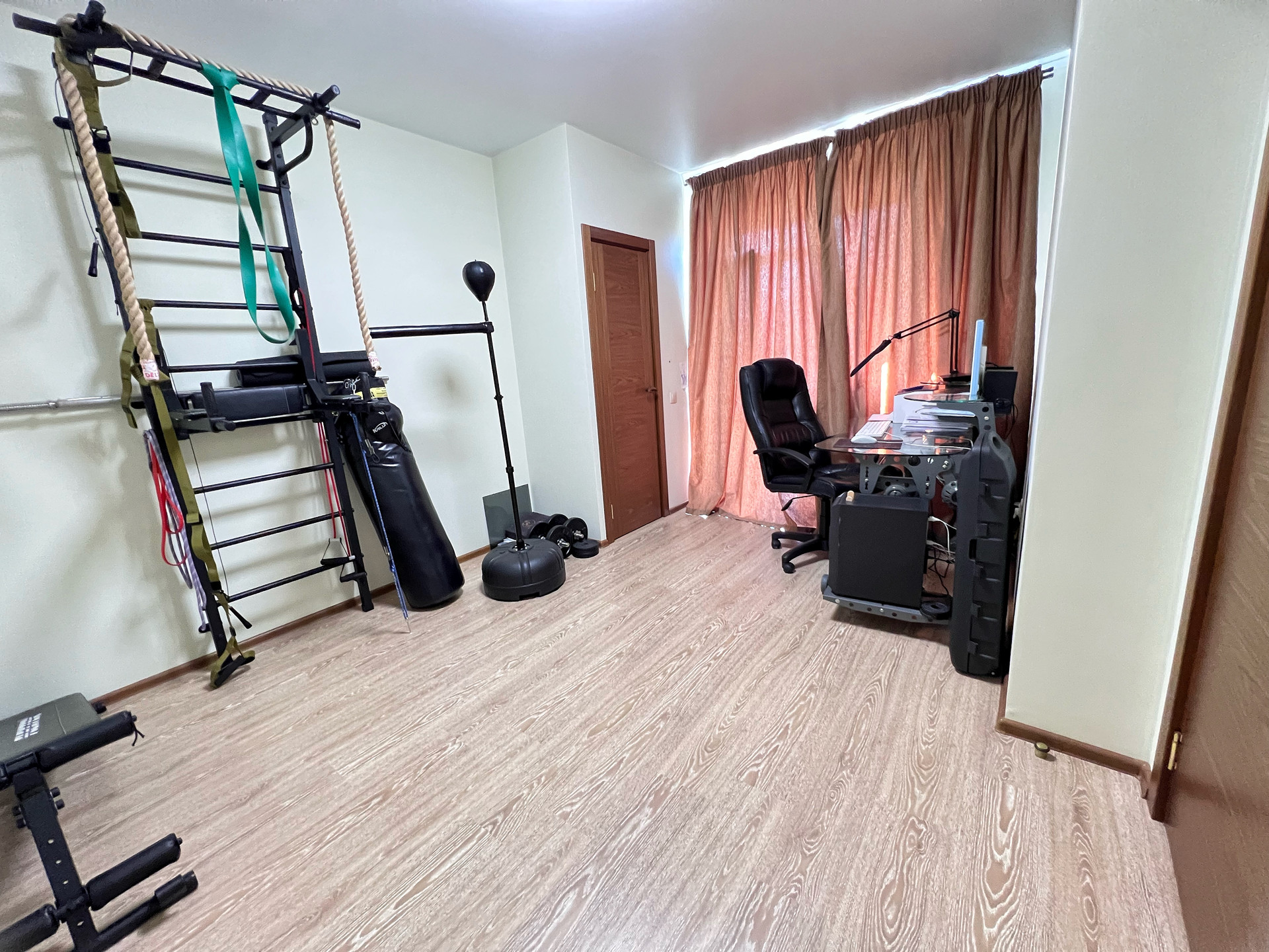 2 этаж •СПАЛЬНАЯ-детская с выходом на балконом: Встроенный шкаф и открытые полочки белого цвета, двухъярусная кровать с двумя матрацами •КАБИНЕТ с выходом на балкон: стеклянный рабочий стол под компьютер, кресло.