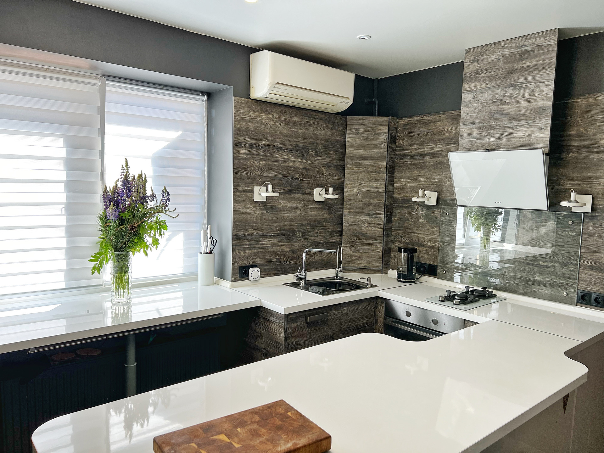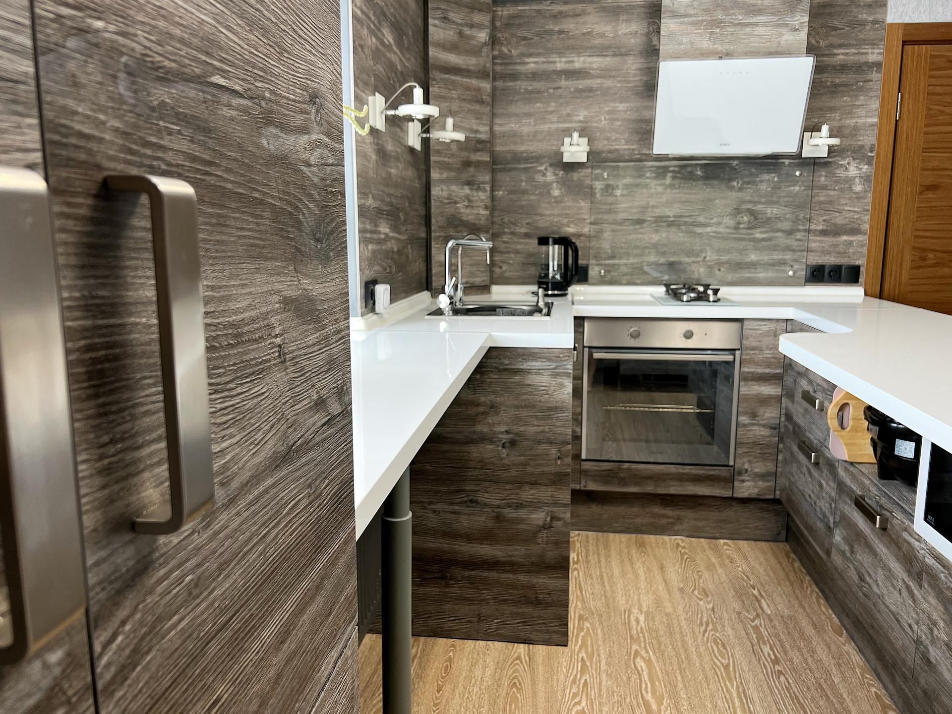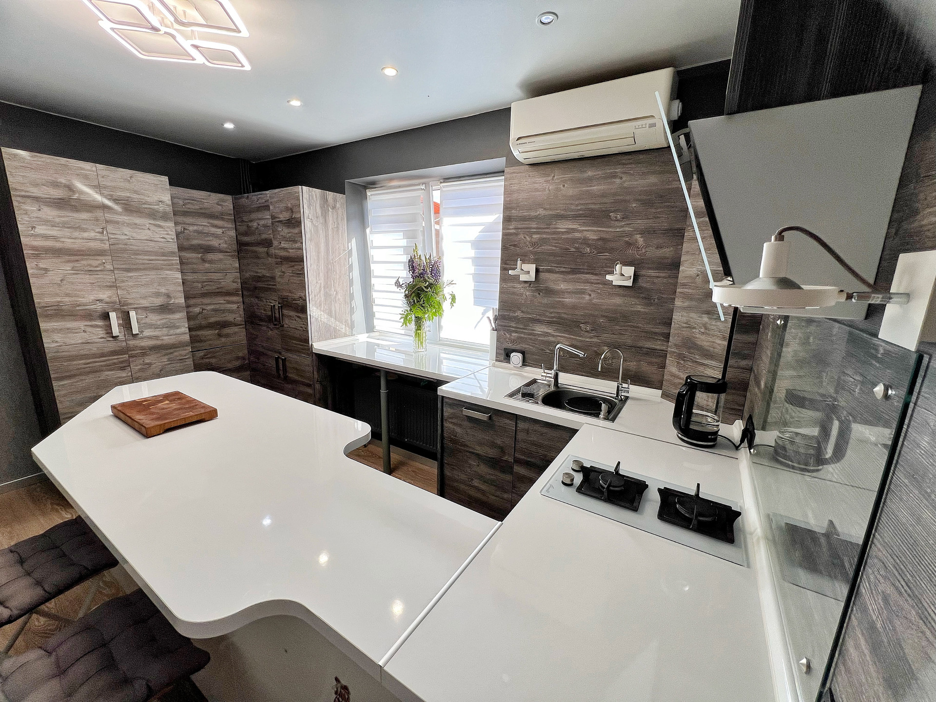 1 этаж •КУХНЯ: Новая, встроенная кухня фабрики Мария, выполненная по дизайнерскому проекту из качественных материалов, с огромной белой глянцевой поверхностью - островом, укомплектована техникой: посудомоечная машина Electrolux, духовой шкаф Gorenje, варочная газовая панель Fornelli, вытяжка Elica •ГОСТИНАЯ: стильный диван с антивандальной поверхностью, раскладывается в двухместное спальное место. КУХНЯ-Гостиная является единым пространством, которое вы можете по собственному вкусу дополнить обеденным столом, телевизором, торшерами и пр. •КЛАДОВАЯ под лестницей: удобное место хранения с полочками разной высоты.