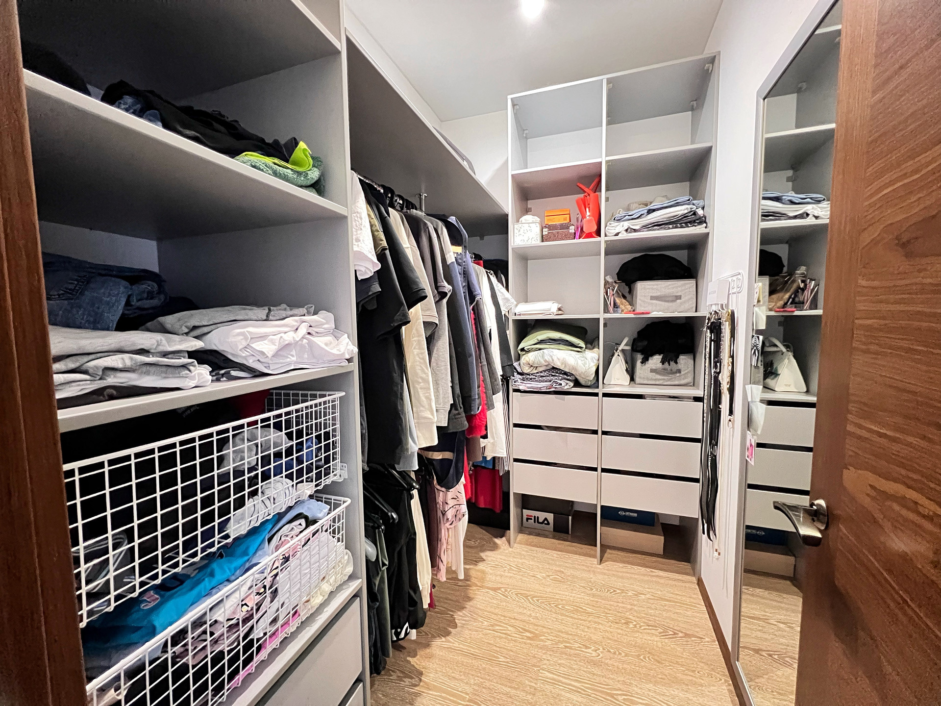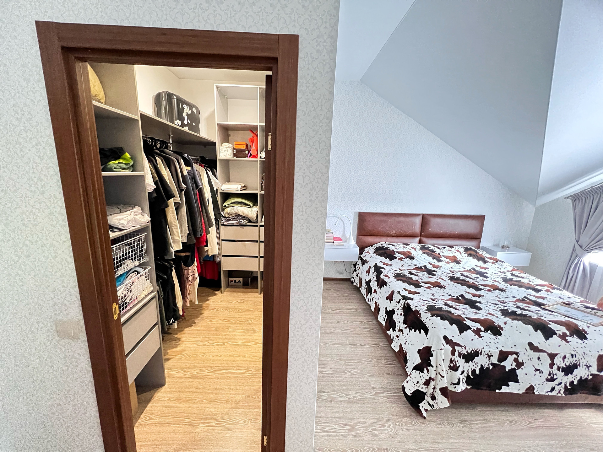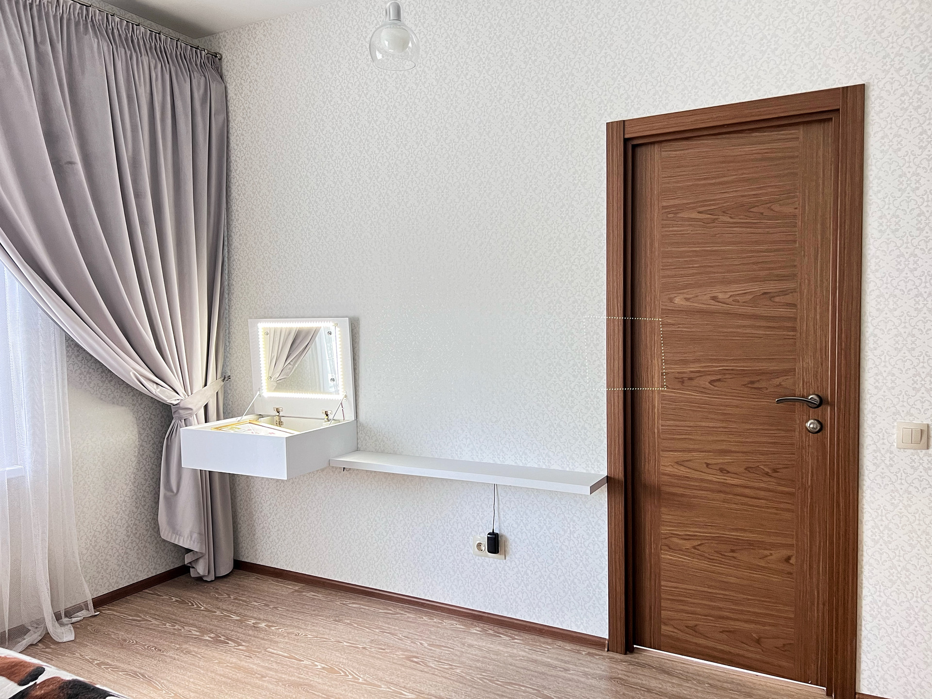 СПАЛЬНАЯ: кровать размер 200Х180, две подвесные прикроватные тумбочки, полочка под телевизор подвесная, подвесной столик с зеркалом для макияжа. •ГАРДЕРОБНАЯ: вместительная отдельная комната, с зеркалом, полочками и рейлингами для вещей.