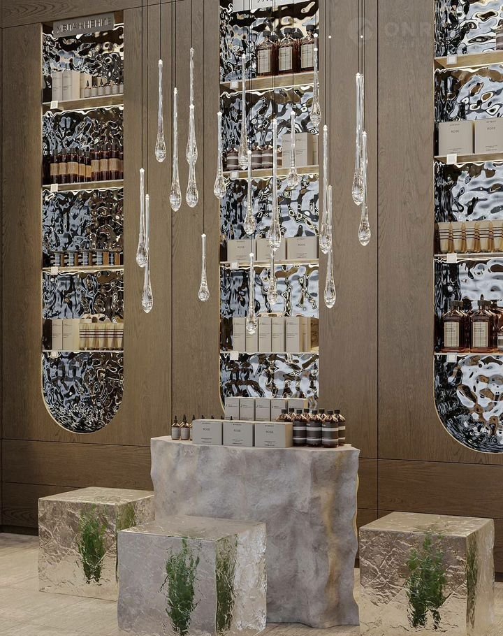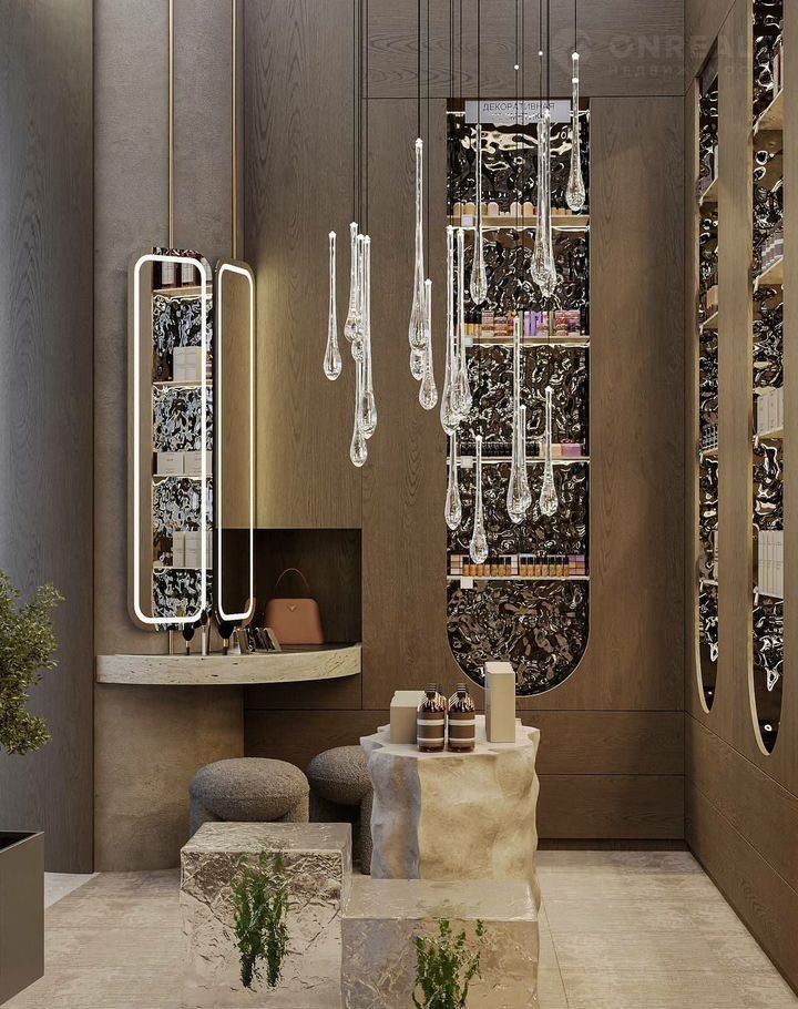 В помещении выполнен дизайнерский ремонт с использованием дорогостоящих, премиальных материалов. Все продумано до мелочей - зонирование, свет, раскладка товара, кассовая зона, место для хранения товара.