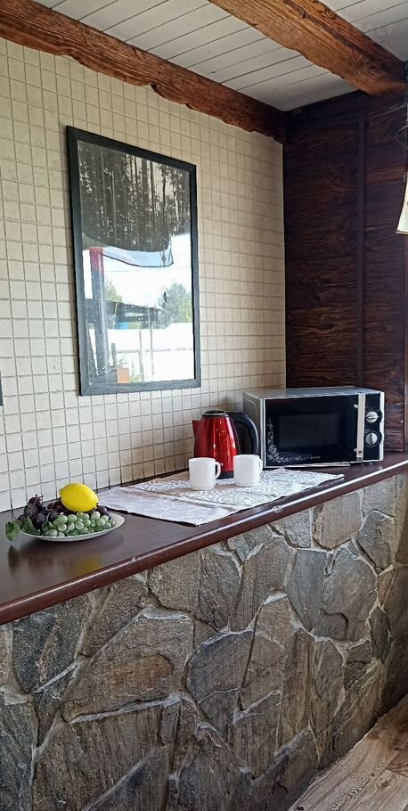 В банкетной зоне большой четырех метровый стол, холодильник, микроволновая печь, электрический чайник, набор столовой посуды, одноразовую посуду и приборы привозите свои.