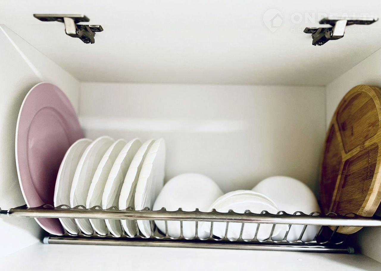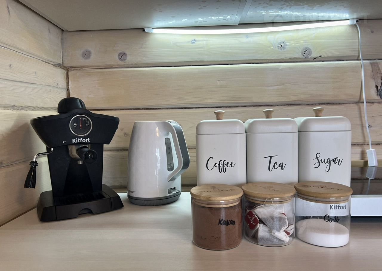 Кухня с плитой, холодильником и всей необходимой посудой, обратите внимание, есть кофемашинка