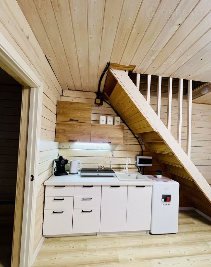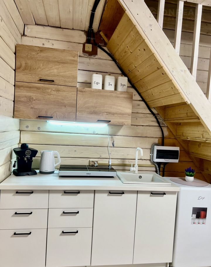 Домик в два этажа, на первом этаже кухня и обеденная зона с панорамным окном, сан.узел с ванной☺️