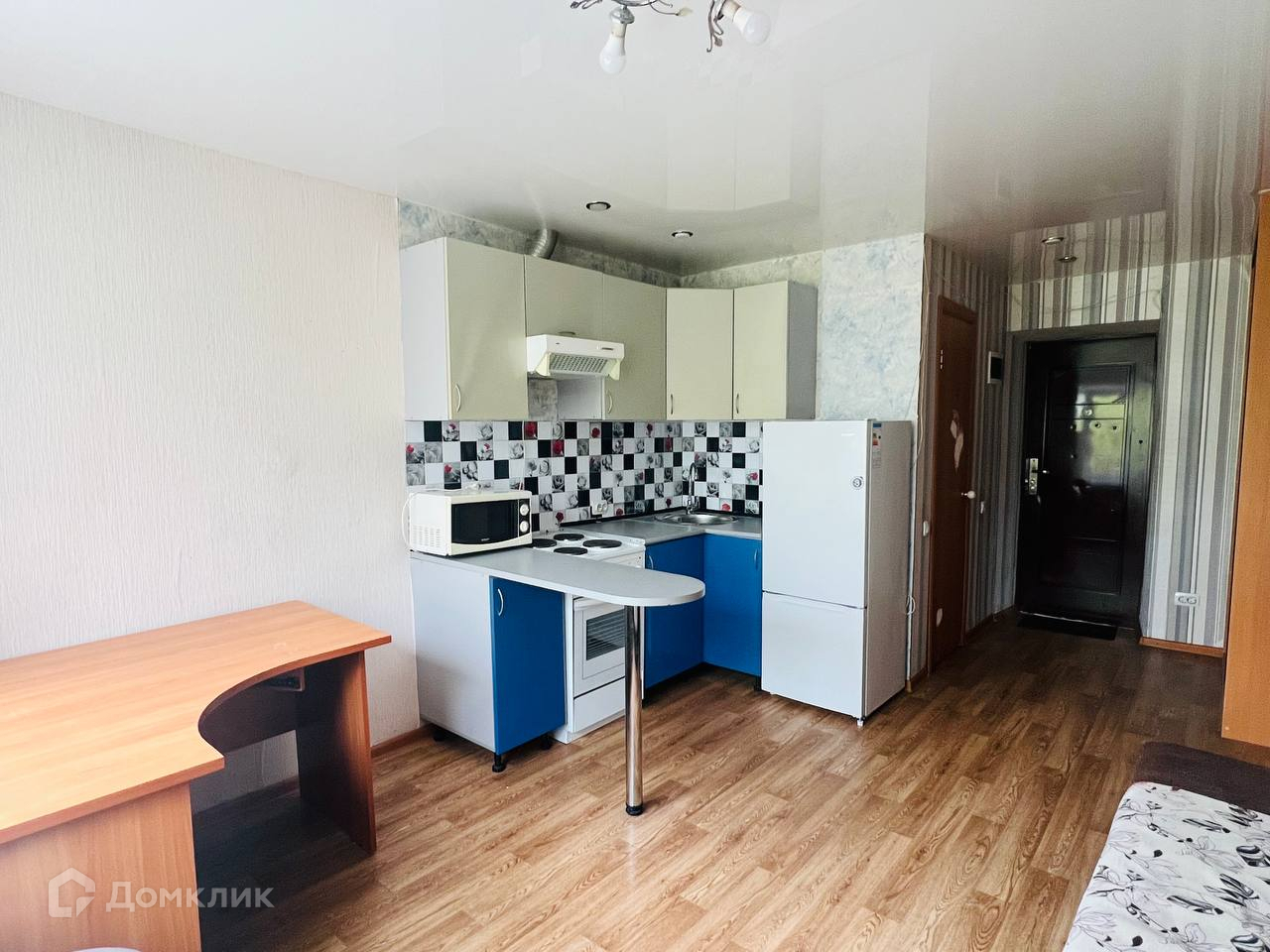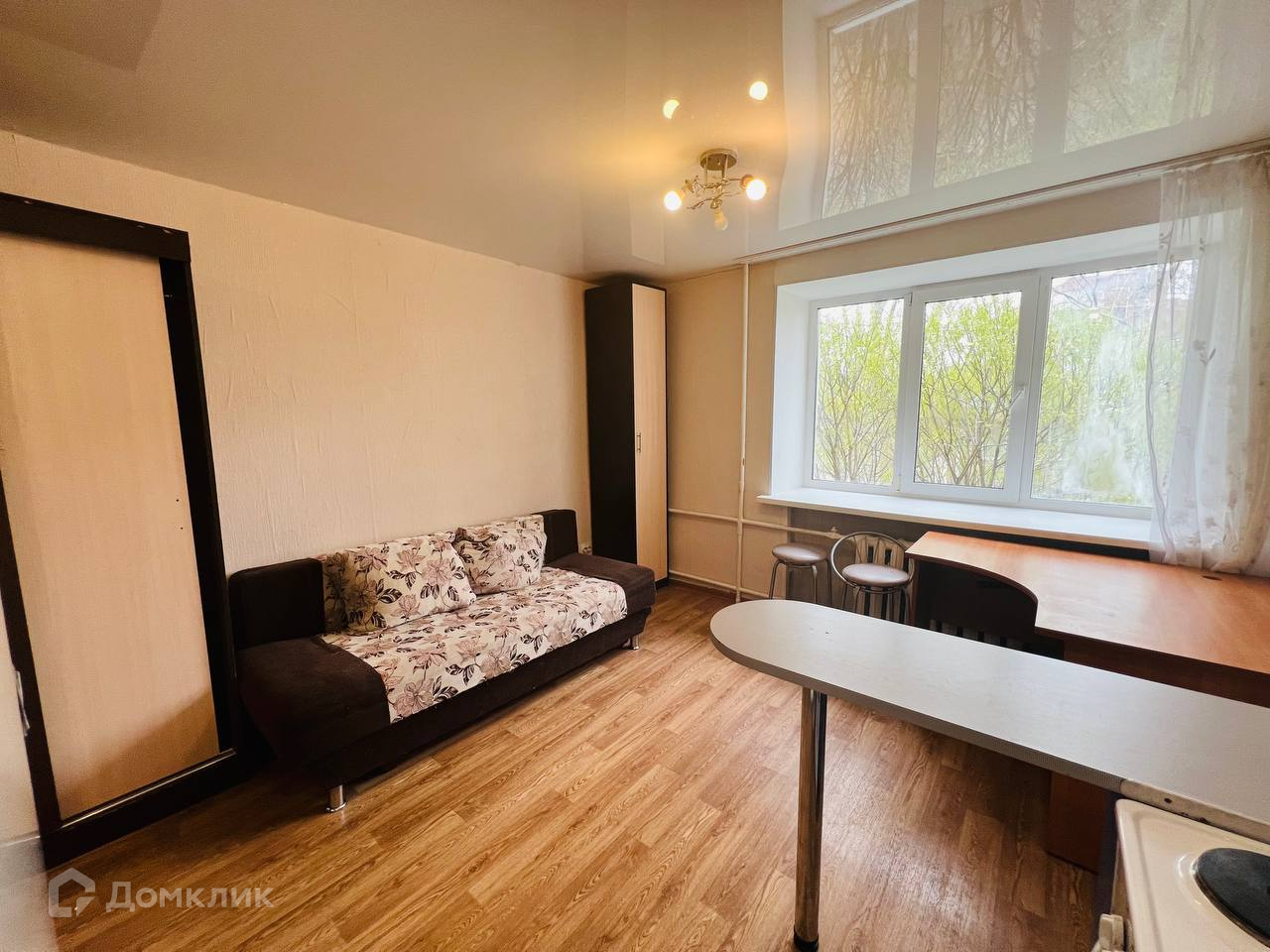 - В комнате имеется удобный диван, кухонный гарнитур, плита, холодильник, шкаф, стиральная машина. На кухне также остается микроволновка и чайник.