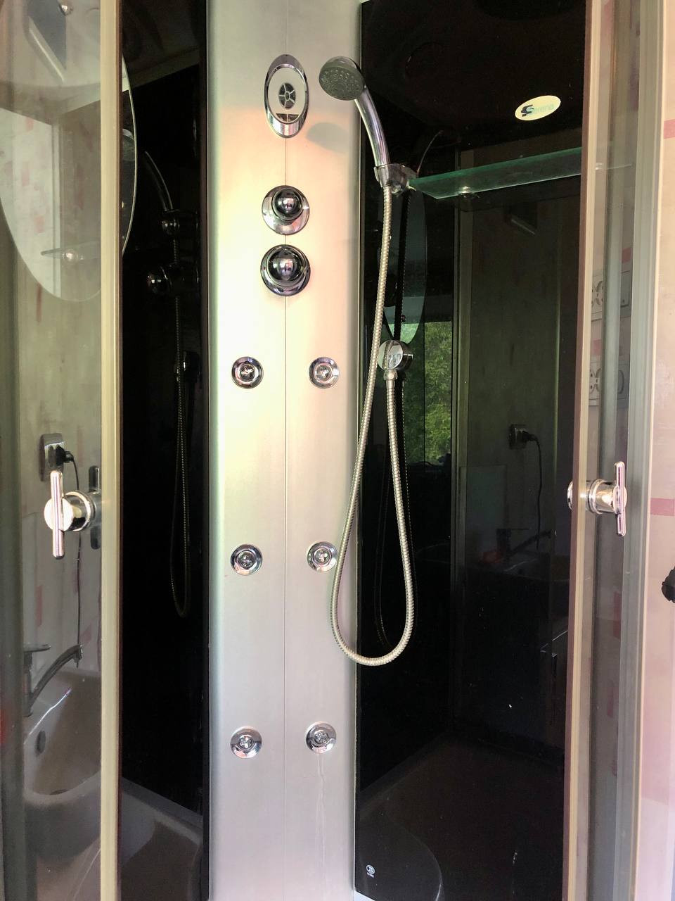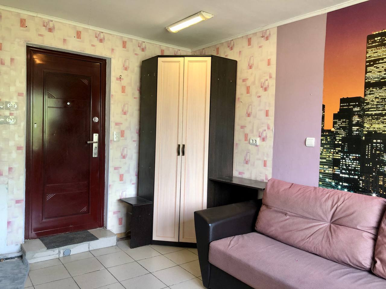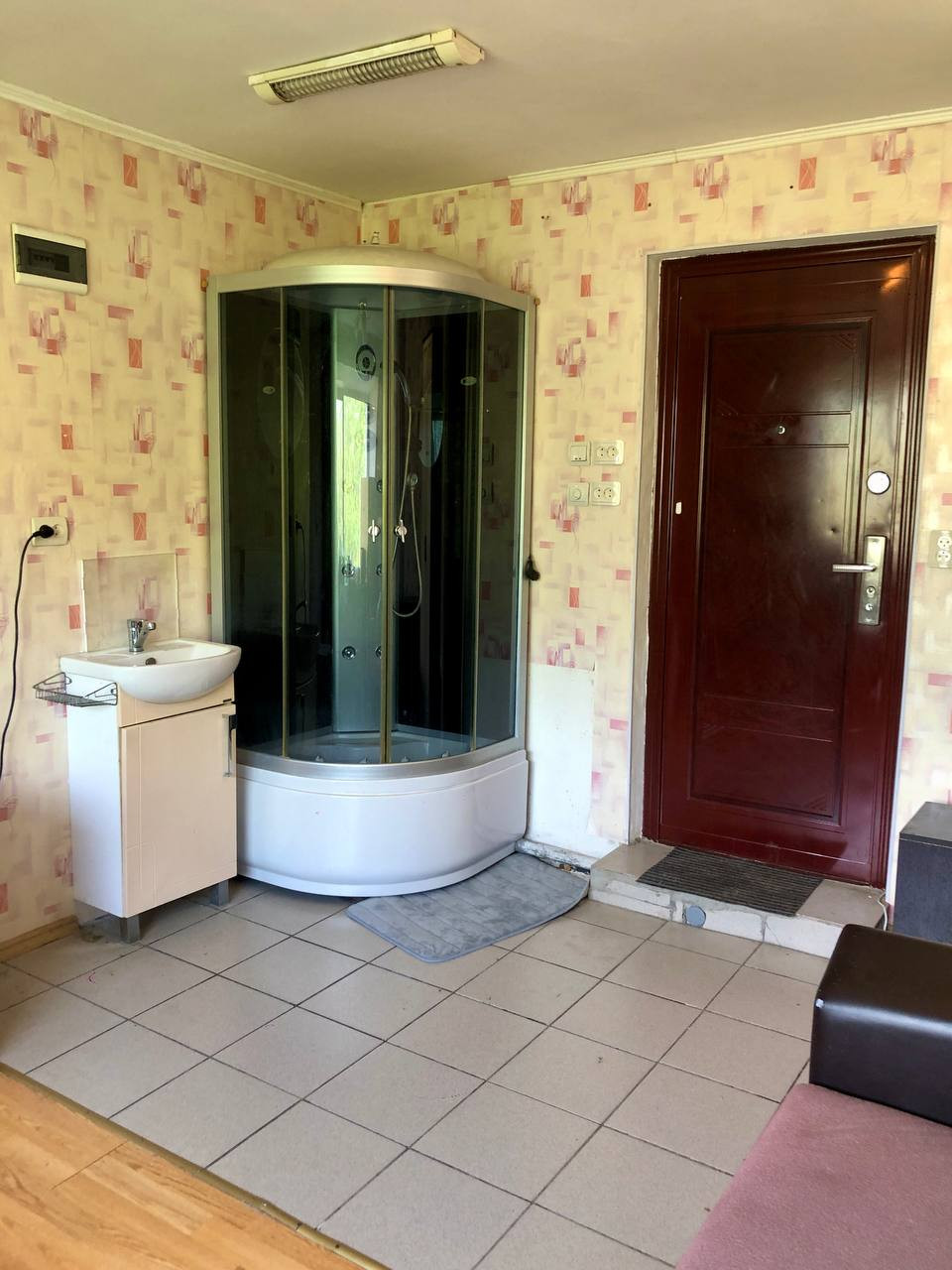 В комнате: Душевая кабина, мойка, стиральная машина, холодильник, шкаф, диван. Санузел в местах общего пользования.