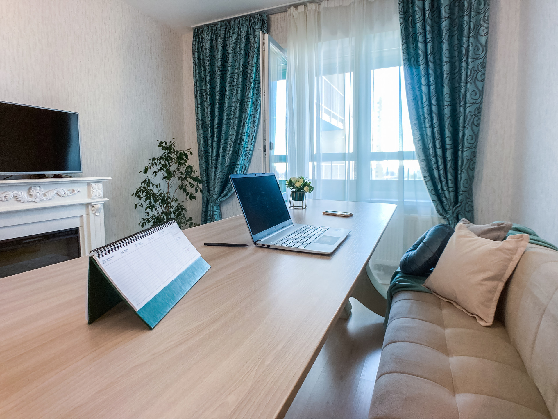удобное просторное рабочее место в гостиной, которое превращается в диван при необходимости
