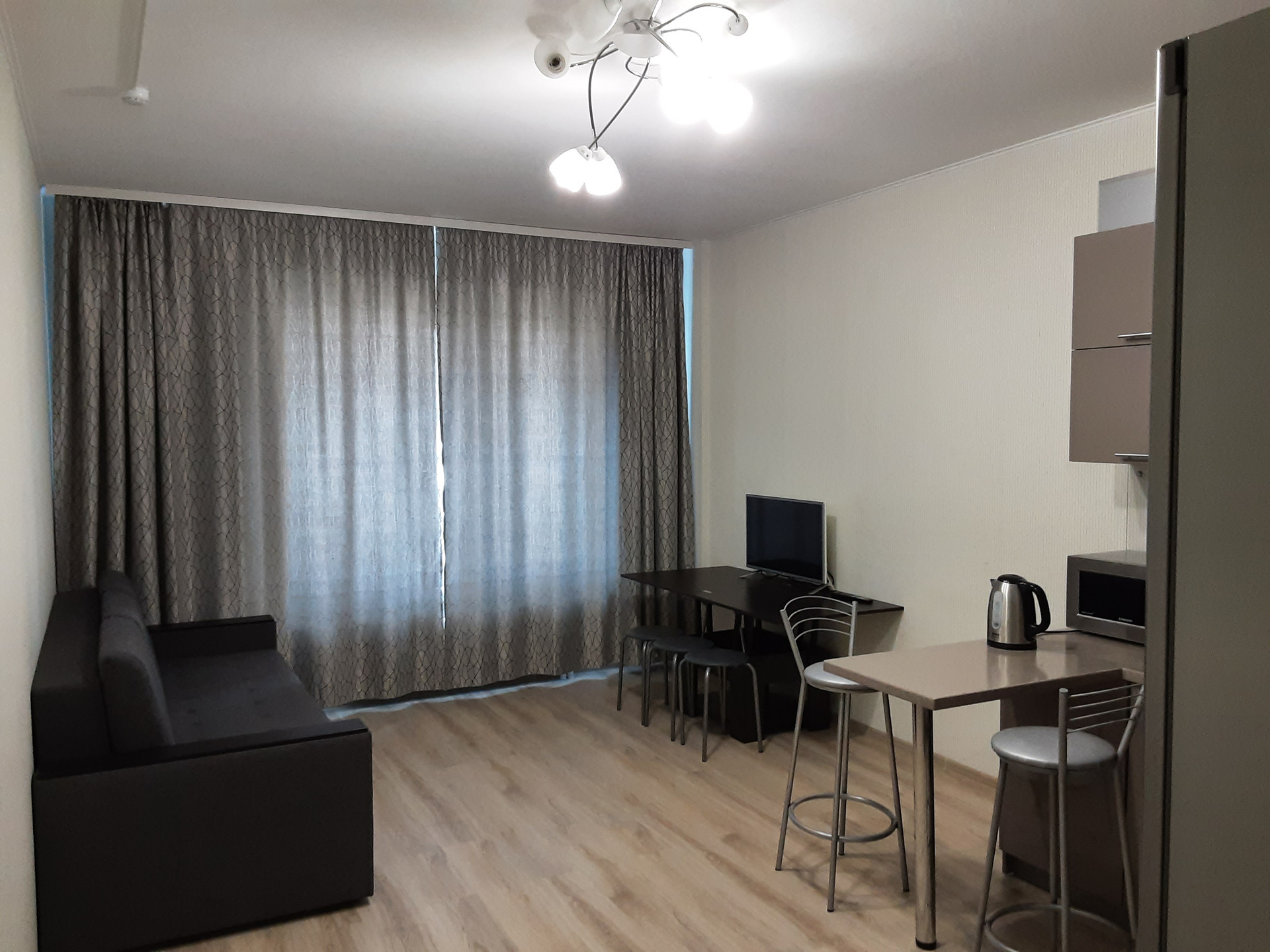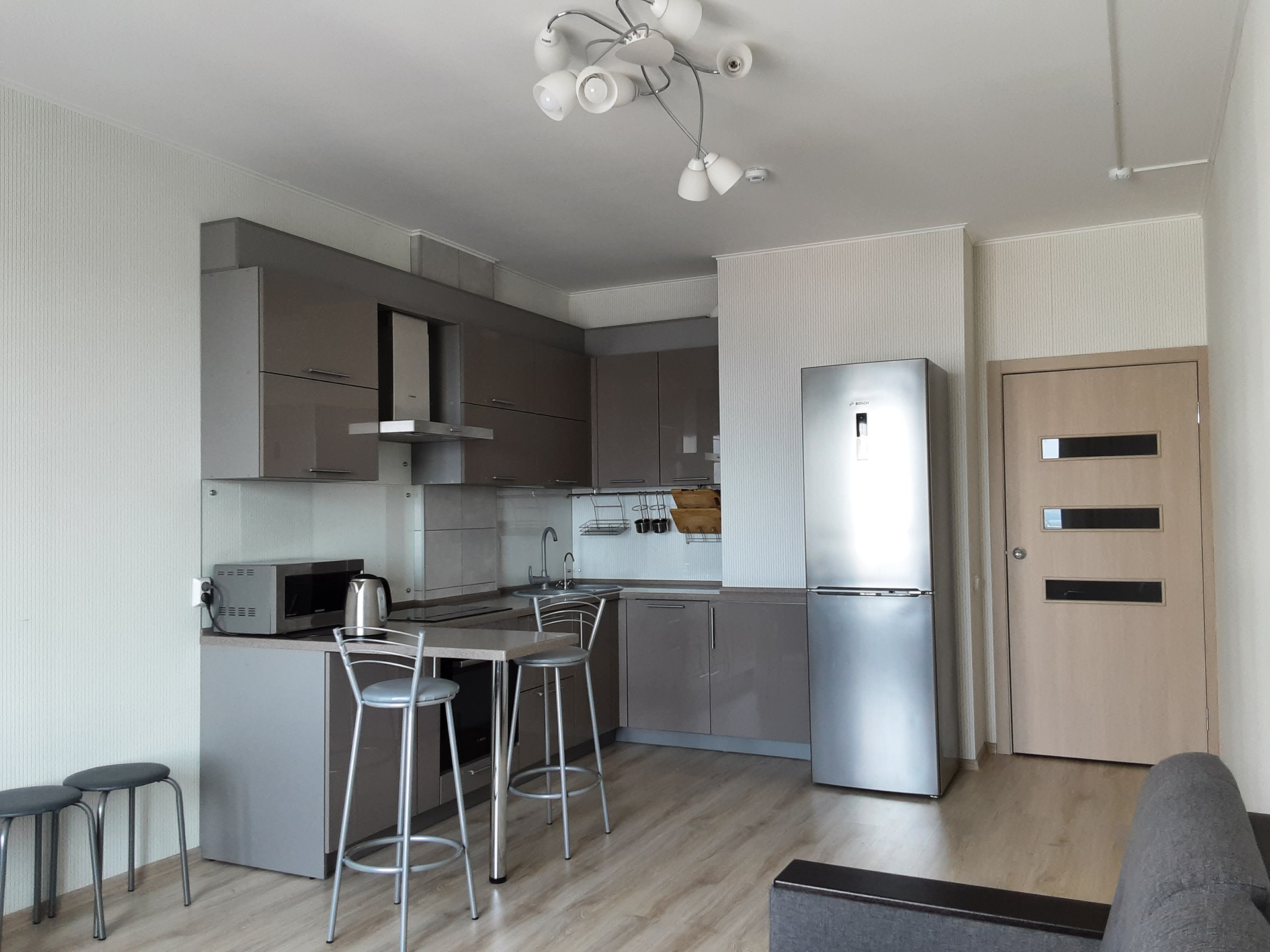 В кухне-гостиной установлен кухонный гарнитур с разделочной поверхностью из искусственного камня, а также имеется расширенное двухстворчатое окно с видом на панораму города Перми с высоты 21-го этажа, окна на закат в сторону реки Камы.