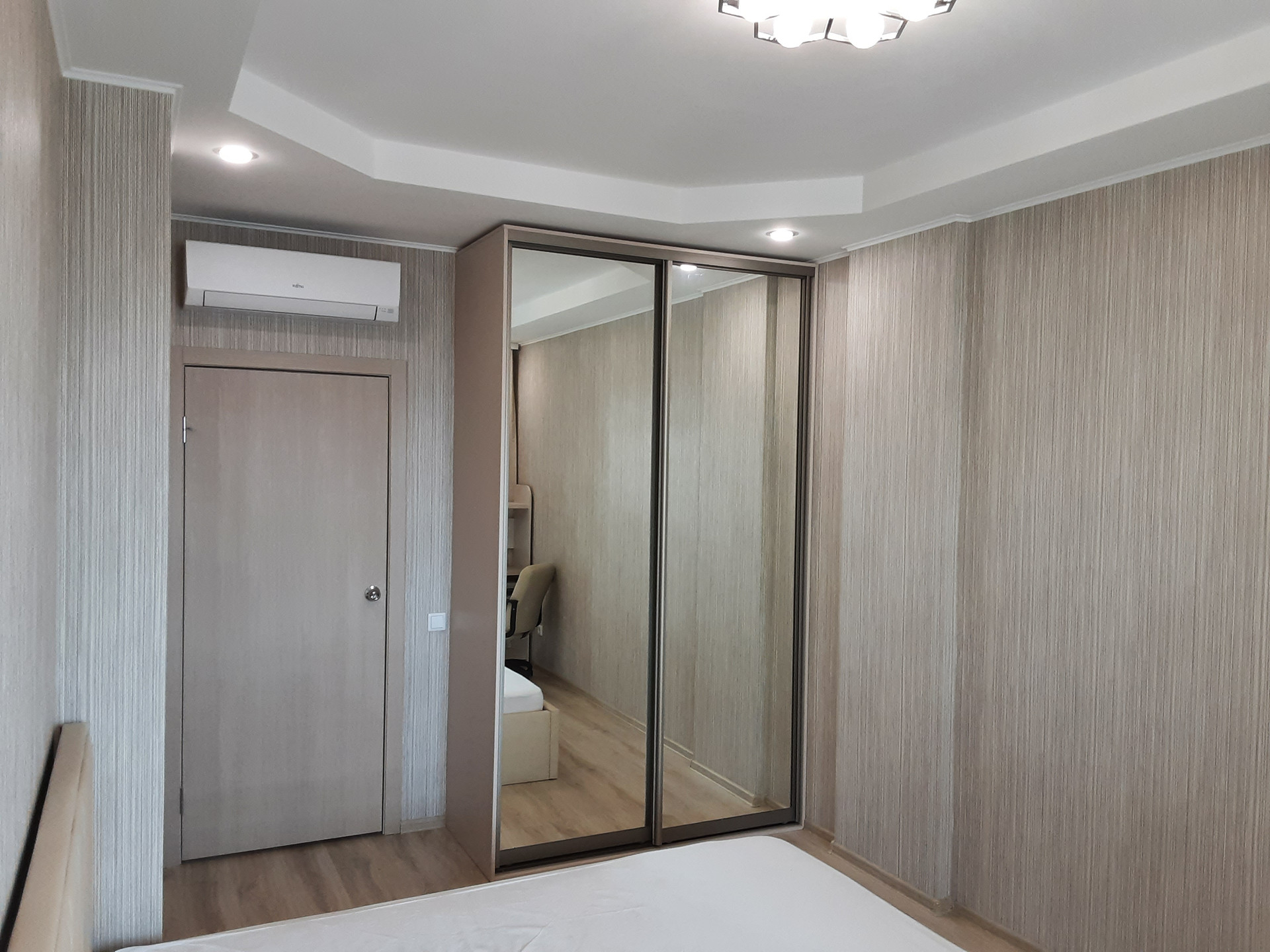В квартире установлен кондиционер с выводом в канализацию, батареи с терморегулятором во всех комнатах, телевизор диагональю 43” со SMART-TV, подогрев пола в ванной, бак-нагреватель/накопитель воды, посудомоечная машина и стационарный фильтр с питьевой водой, имеется двухспальная кровать шириной 160 см. и раскладной диван, отдельная комната-гардероб, внутри обустроенная шкафами и ящиками.