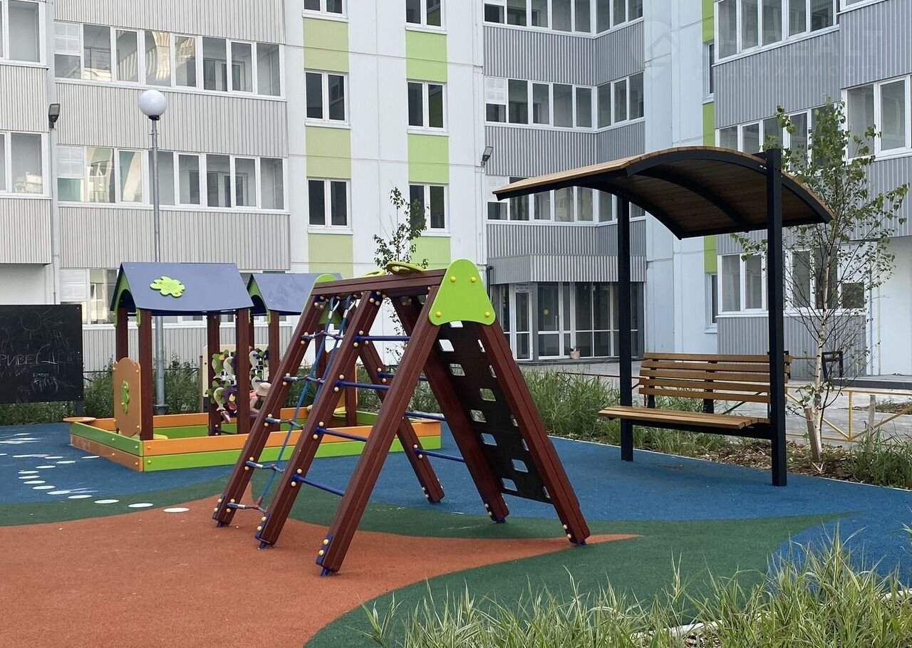 Остановка возле дома. Магазин во дворе. Закрытый двор с детской площадкой внутри дома и парковкой по периметру