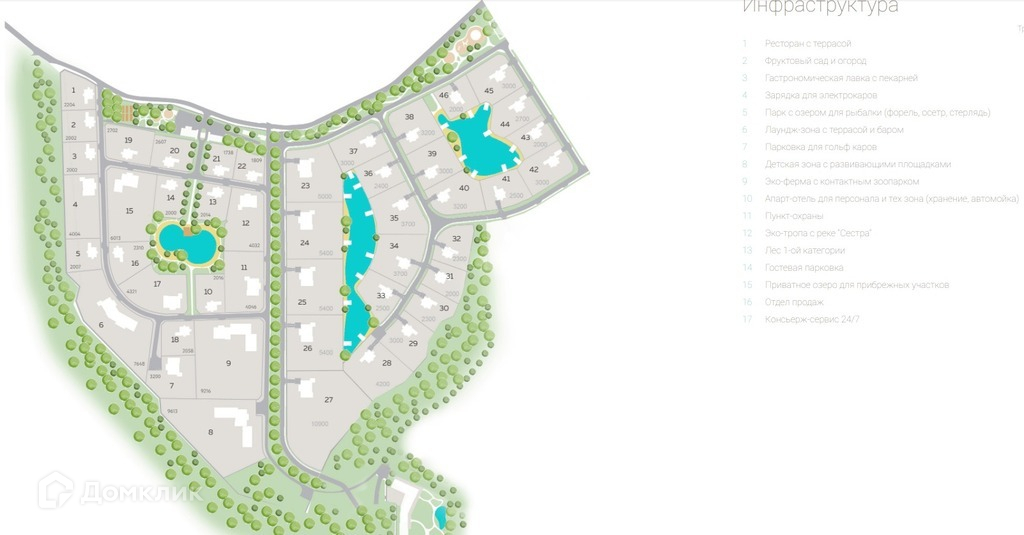 - Прогулочные аллеи, экотропа к реке Сестре, детские площадки.