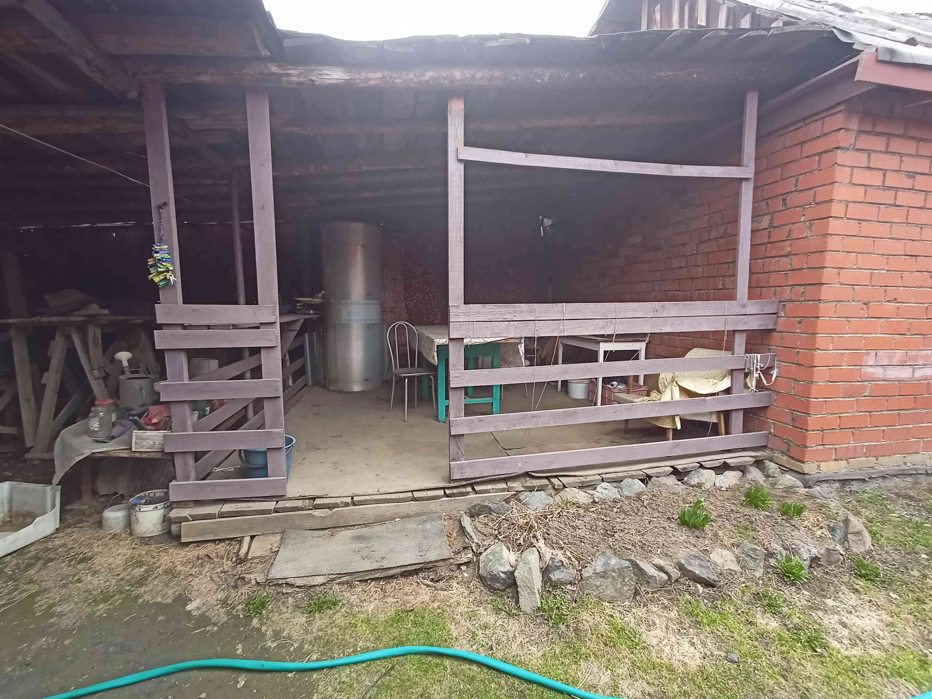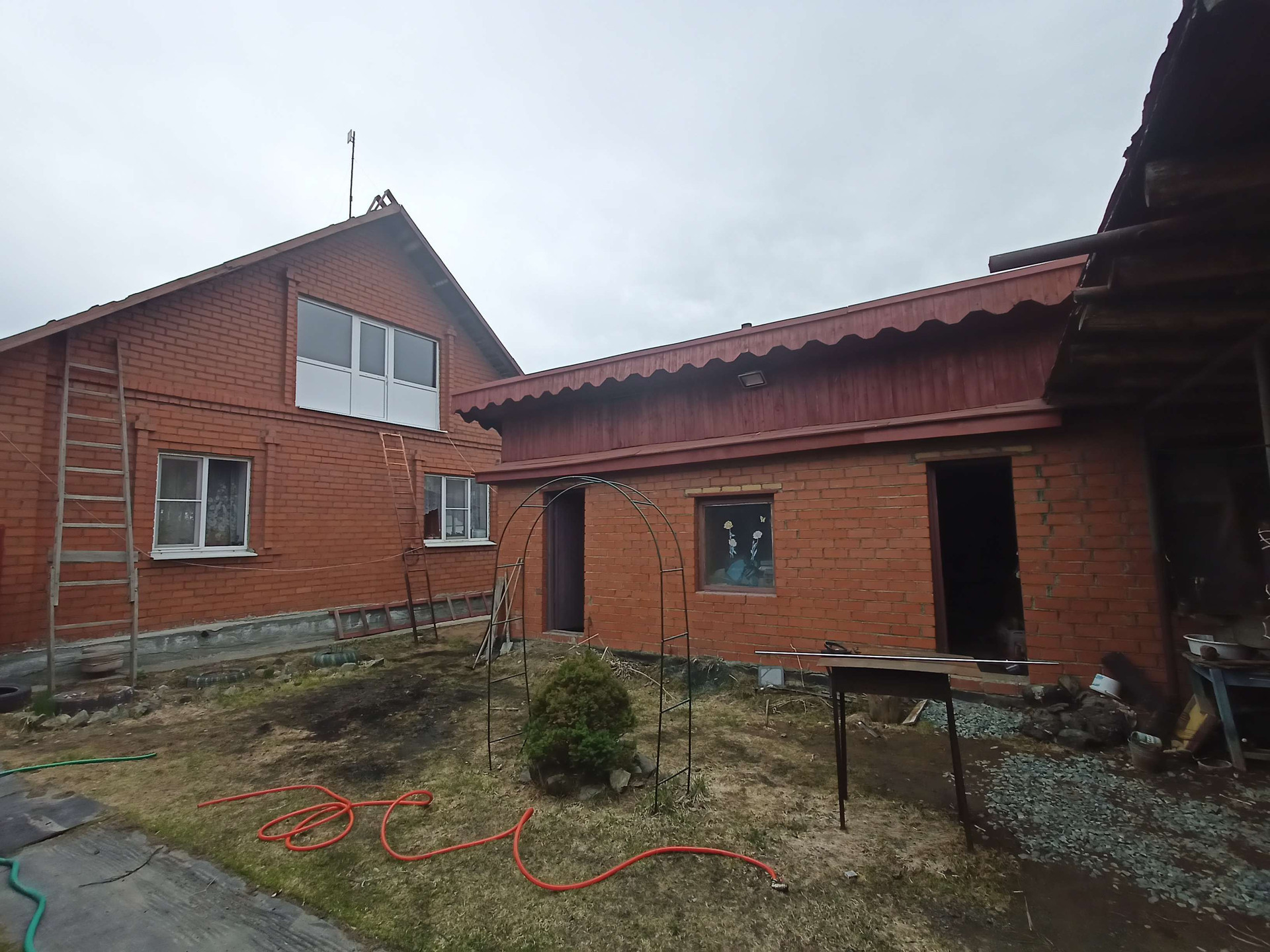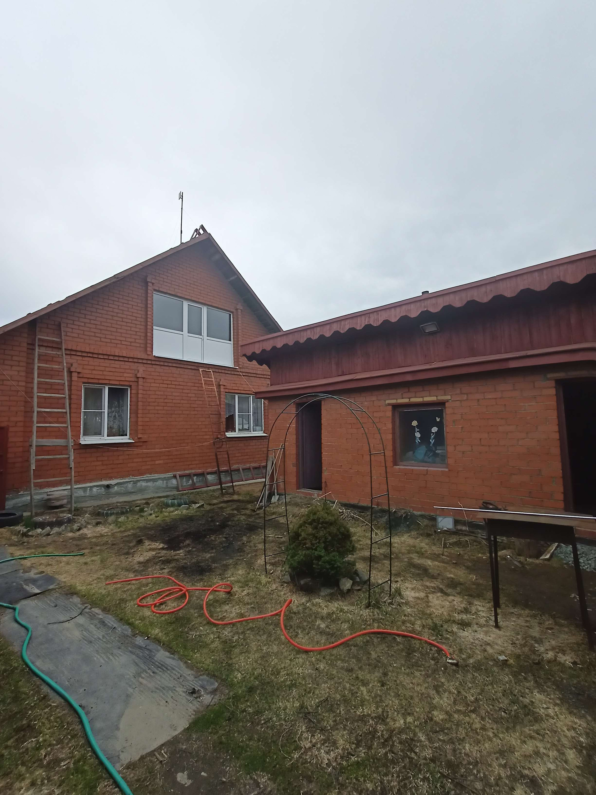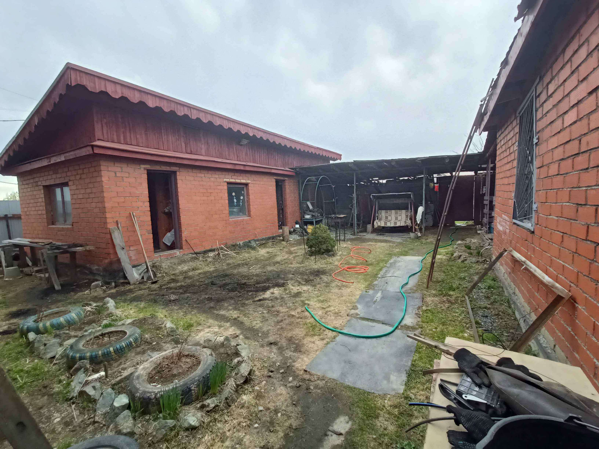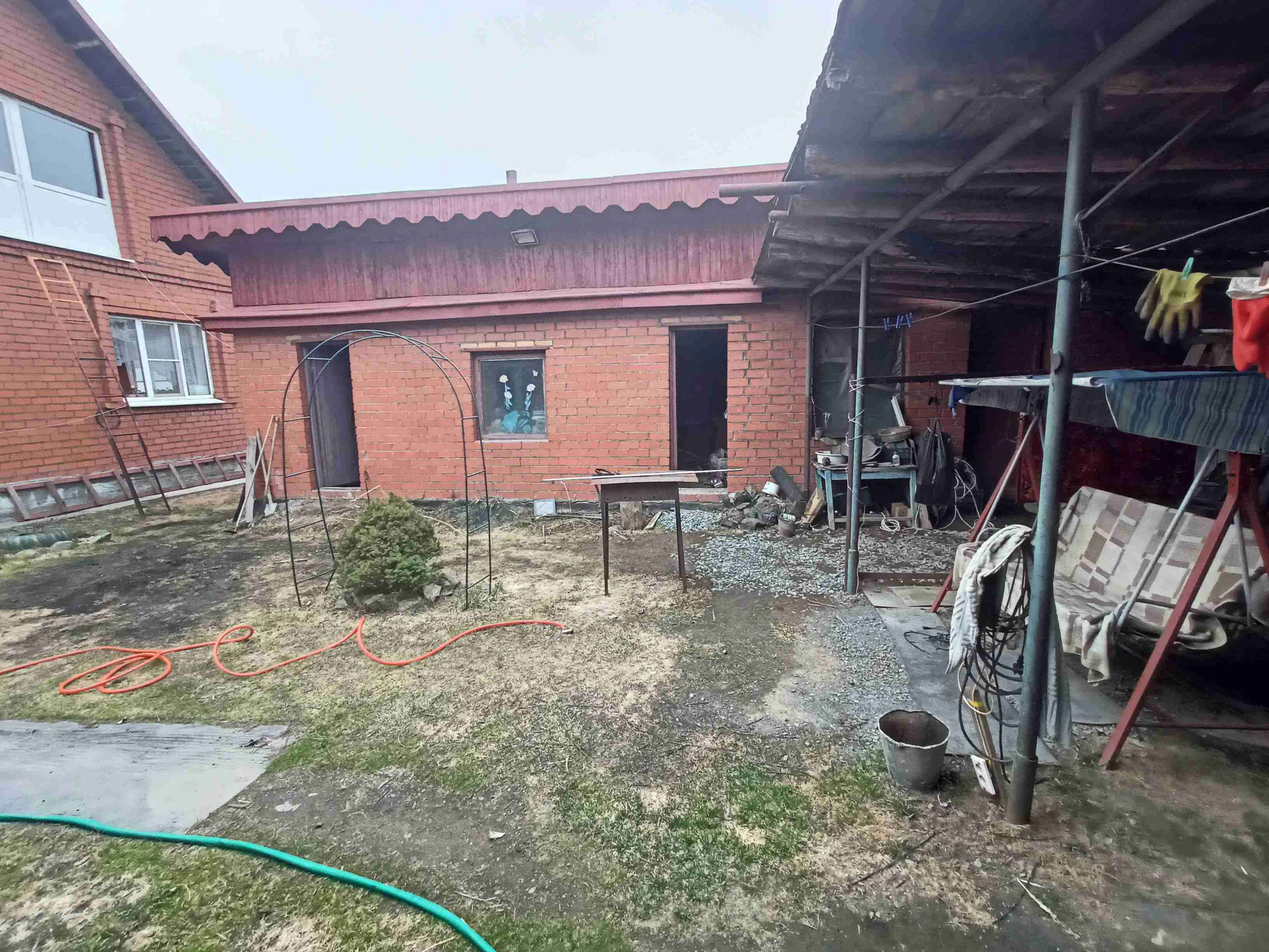 Крытый двор, гараж, баня, летний домик из кирпича на фундаменте, беседка.