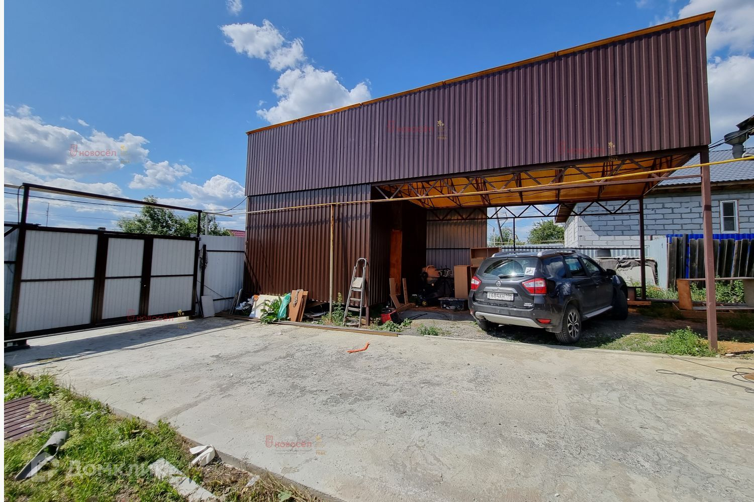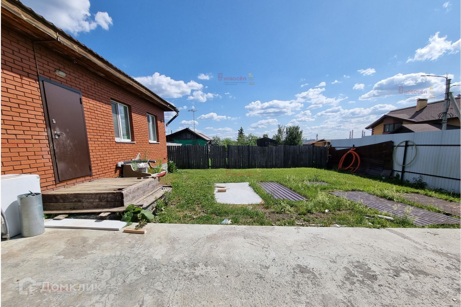 На участке газон, фруктовые деревья. От проезжей улицы до гаража залит бетон. Участок огорожен. Автоматические ворота с калиткой.